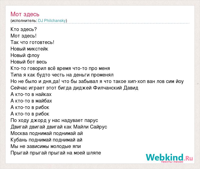 Кто здесь? Мот здесь! Так что готовтесь! Новый микстейк Новый флоу Новый бот весь Кто-то говорил всё время что-то про меня Типа я как будто честь на деньги променял Но не было и дня,да! что бы забывал я что такое хип-хоп ван лов сим йоу Сейчас играет этот бигда диджей Филчанский Давид А кто-то в найках А кто-то в майбах А кто-то в рибок А кто-то в рибок По ходу джорд у нас надувает парус Двигай двигай двигай как Майли Сайрус Москва поднимай поднимай ай Кубань поднимай поднимай ай Мы не зависимы молодые япи Прыгай прыгай прыгай на моей шляпе