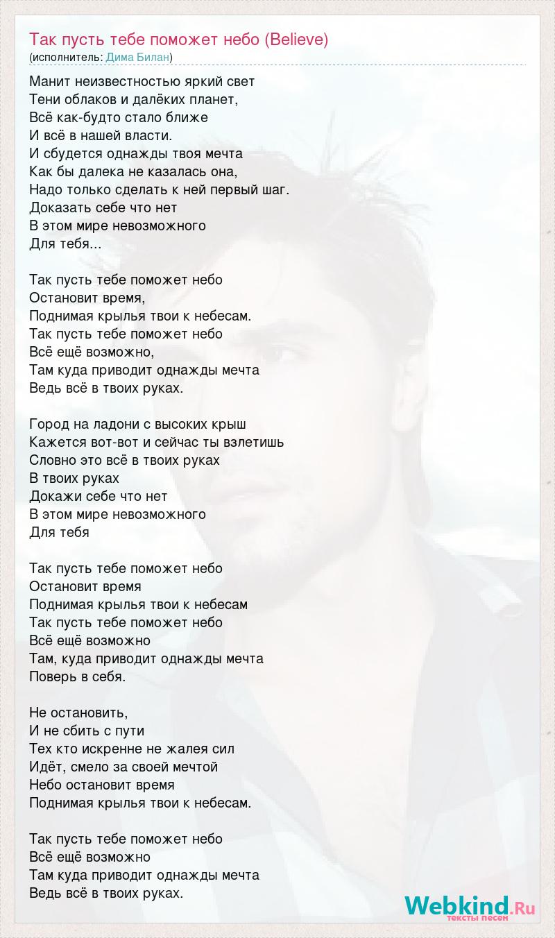 Манит неизвестностью яркий свет Тени облаков и далёких планет, Всё как-будто стало ближе И всё в нашей власти. И сбудется однажды твоя мечта Как бы далека не казалась она, Надо только сделать к ней первый шаг. Доказать себе что нет В этом мире невозможного Для тебя... Так пусть тебе поможет небо Остановит время, Поднимая крылья твои к небесам. Так пусть тебе поможет небо Всё ещё возможно, Там куда приводит однажды мечта Ведь всё в твоих руках. Город на ладони с высоких крыш Кажется вот-вот и сейчас ты взлетишь Словно это всё в твоих руках В твоих руках Докажи себе что нет В этом мире невозможного Для тебя Так пусть тебе поможет небо Остановит время Поднимая крылья твои к небесам Так пусть тебе поможет небо Всё ещё возможно Там, куда приводит однажды мечта Поверь в себя. Не остановить, И не сбить с пути Тех кто искренне не жалея сил Идёт, смело за своей мечтой Небо остановит время Поднимая крылья твои к небесам. Так пусть тебе поможет небо Всё ещё возможно Там куда приводит однажды мечта Ведь всё в твоих руках.