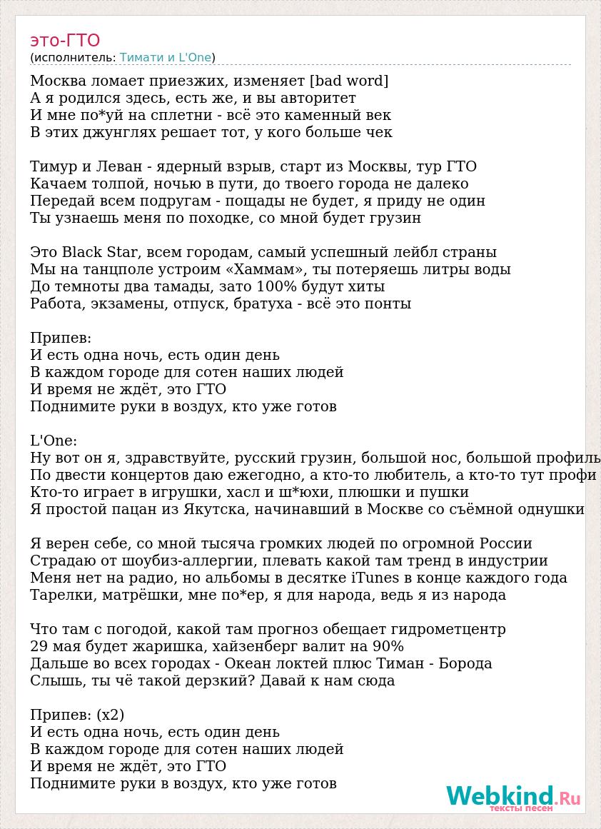 Москва ломает приезжих, изменяет [bad word] А я родился здесь, есть же, и вы авторитет И мне по*уй на сплетни - всё это каменный век В этих джунглях решает тот, у кого больше чек Тимур и Леван - ядерный взрыв, старт из Москвы, тур ГТО Качаем толпой, ночью в пути, до твоего города не далеко Передай всем подругам - пощады не будет, я приду не один Ты узнаешь меня по походке, со мной будет грузин Это Black Star, всем городам, самый успешный лейбл страны Мы на танцполе устроим «Хаммам», ты потеряешь литры воды До темноты два тамады, зато 100% будут хиты Работа, экзамены, отпуск, братуха - всё это понты Припев: И есть одна ночь, есть один день В каждом городе для сотен наших людей И время не ждёт, это ГТО Поднимите руки в воздух, кто уже готов L'One: Ну вот он я, здравствуйте, русский грузин, большой нос, большой профиль По двести концертов даю ежегодно, а кто-то любитель, а кто-то тут профи Кто-то играет в игрушки, хасл и ш*юхи, плюшки и пушки Я простой пацан из Якутска, начинавший в Москве со съёмной однушки Я верен себе, со мной тысяча громких людей по огромной России Страдаю от шоубиз-аллергии, плевать какой там тренд в индустрии Меня нет на радио, но альбомы в десятке iTunes в конце каждого года Тарелки, матрёшки, мне по*ер, я для народа, ведь я из народа Что там с погодой, какой там прогноз обещает гидрометцентр 29 мая будет жаришка, хайзенберг валит на 90% Дальше во всех городах - Океан локтей плюс Тиман - Борода Слышь, ты чё такой дерзкий? Давай к нам сюда Припев: (х2) И есть одна ночь, есть один день В каждом городе для сотен наших людей И время не ждёт, это ГТО Поднимите руки в воздух, кто уже готов