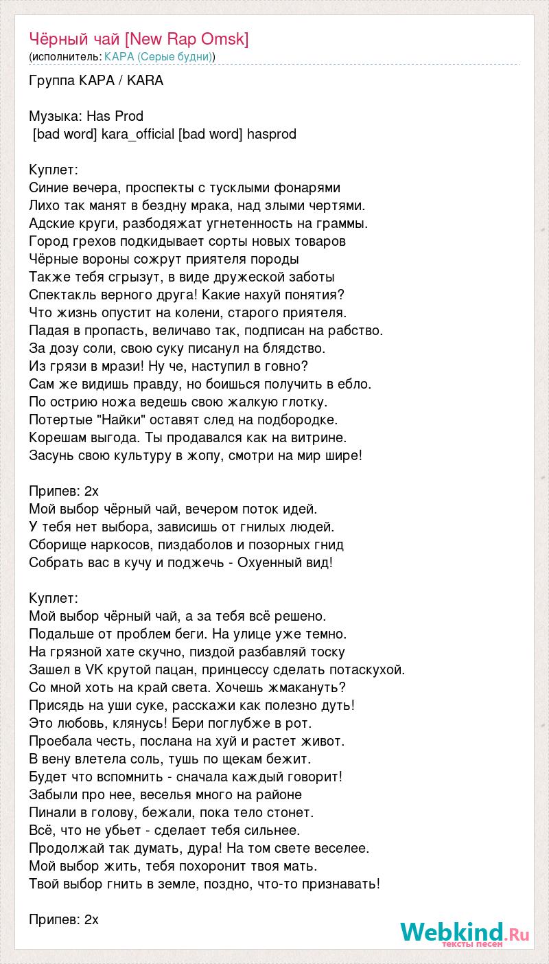 Группа КАРА / KARA Музыка: Has Prod [bad word] kara_official [bad word] hasprod Куплет: Синие вечера, проспекты с тусклыми фонарями Лихо так манят в бездну мрака, над злыми чертями. Адские круги, разбодяжат угнетенность на граммы. Город грехов подкидывает сорты новых товаров Чёрные вороны сожрут приятеля породы Также тебя сгрызут, в виде дружеской заботы Спектакль верного друга! Какие нахуй понятия? Что жизнь опустит на колени, старого приятеля. Падая в пропасть, величаво так, подписан на рабство. За дозу соли, свою суку писанул на блядство. Из грязи в мрази! Ну че, наступил в говно? Сам же видишь правду, но боишься получить в ебло. По острию ножа ведешь свою жалкую глотку. Потертые "Найки" оставят след на подбородке. Корешам выгода. Ты продавался как на витрине. Засунь свою культуру в жопу, смотри на мир шире! Припев: 2х Мой выбор чёрный чай, вечером поток идей. У тебя нет выбора, зависишь от гнилых людей. Сборище наркосов, пиздаболов и позорных гнид Собрать вас в кучу и поджечь - Охуенный вид! Куплет: Мой выбор чёрный чай, а за тебя всё решено. Подальше от проблем беги. На улице уже темно. На грязной хате скучно, пиздой разбавляй тоску Зашел в VK крутой пацан, принцессу сделать потаскухой. Со мной хоть на край света. Хочешь жмакануть? Присядь на уши суке, расскажи как полезно дуть! Это любовь, клянусь! Бери поглубже в рот. Проебала честь, послана на хуй и растет живот. В вену влетела соль, тушь по щекам бежит. Будет что вспомнить - сначала каждый говорит! Забыли про нее, веселья много на районе Пинали в голову, бежали, пока тело стонет. Всё, что не убьет - сделает тебя сильнее. Продолжай так думать, дура! На том свете веселее. Мой выбор жить, тебя похоронит твоя мать. Твой выбор гнить в земле, поздно, что-то признавать! Припев: 2х