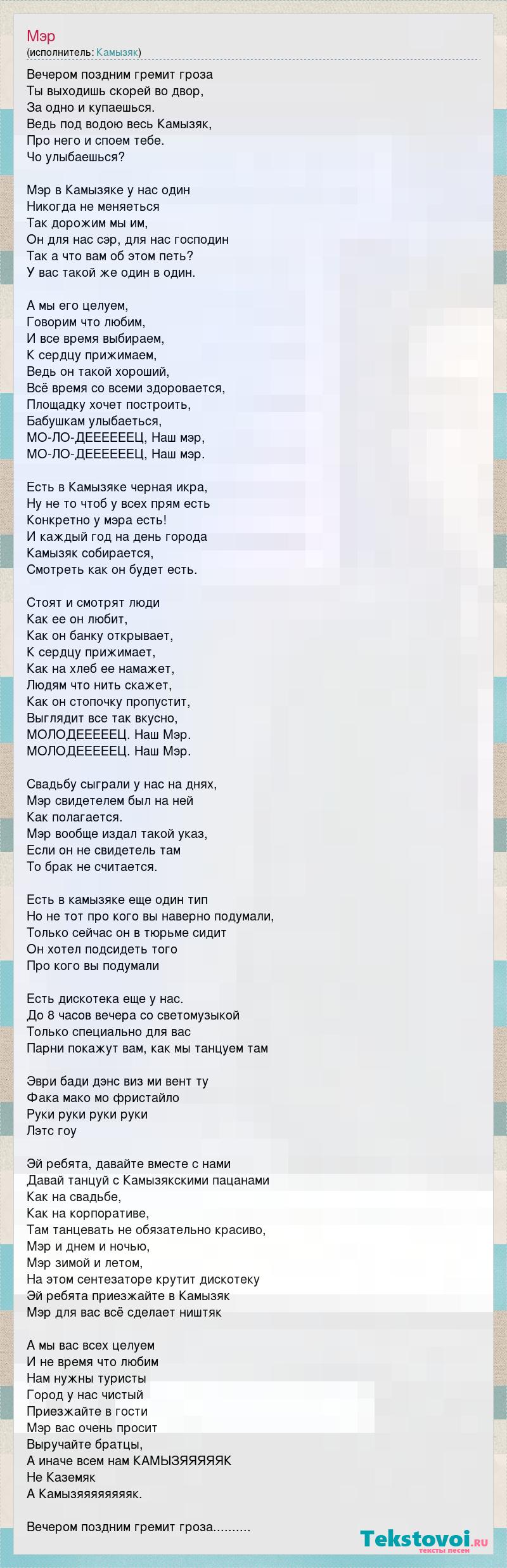 Вечером поздним гремит гроза Ты выходишь скорей во двор, За одно и купаешься. Ведь под водою весь Камызяк, Про него и споем тебе. Чо улыбаешься? Мэр в Камызяке у нас один Никогда не меняеться Так дорожим мы им, Он для нас сэр, для нас господин Так а что вам об этом петь? У вас такой же один в один. А мы его целуем, Говорим что любим, И все время выбираем, К сердцу прижимаем, Ведь он такой хороший, Всё время со всеми здоровается, Площадку хочет построить, Бабушкам улыбаеться, МО-ЛО-ДЕЕЕЕЕЕЦ, Наш мэр, МО-ЛО-ДЕЕЕЕЕЕЦ, Наш мэр. Есть в Камызяке черная икра, Ну не то чтоб у всех прям есть Конкретно у мэра есть! И каждый год на день города Камызяк собирается, Смотреть как он будет есть. Стоят и смотрят люди Как ее он любит, Как он банку открывает, К сердцу прижимает, Как на хлеб ее намажет, Людям что нить скажет, Как он стопочку пропустит, Выглядит все так вкусно, МОЛОДЕЕЕЕЕЦ. Наш Мэр. МОЛОДЕЕЕЕЕЦ. Наш Мэр. Свадьбу сыграли у нас на днях, Мэр свидетелем был на ней Как полагается. Мэр вообще издал такой указ, Если он не свидетель там То брак не считается. Есть в камызяке еще один тип Но не тот про кого вы наверно подумали, Только сейчас он в тюрьме сидит Он хотел подсидеть того Про кого вы подумали Есть дискотека еще у нас. До 8 часов вечера со светомузыкой Только специально для вас Парни покажут вам, как мы танцуем там Эври бади дэнс виз ми вент ту Фака мако мо фристайло Руки руки руки руки Лэтс гоу Эй ребята, давайте вместе с нами Давай танцуй с Камызякскими пацанами Как на свадьбе, Как на корпоративе, Там танцевать не обязательно красиво, Мэр и днем и ночью, Мэр зимой и летом, На этом сентезаторе крутит дискотеку Эй ребята приезжайте в Камызяк Мэр для вас всё сделает ништяк А мы вас всех целуем И не время что любим Нам нужны туристы Город у нас чистый Приезжайте в гости Мэр вас очень просит Выручайте братцы, А иначе всем нам КАМЫЗЯЯЯЯЯК Не Каземяк А Камызяяяяяяяяк. Вечером поздним гремит гроза..........