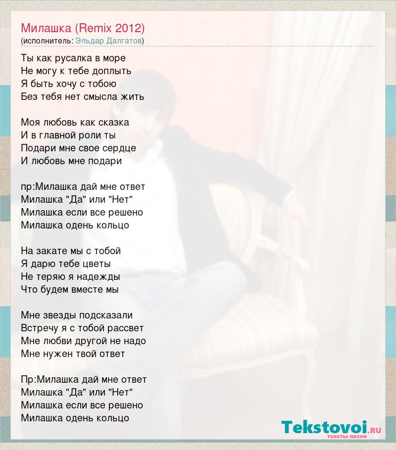 Ты как русалка в море Не могу к тебе доплыть Я быть хочу с тобою Без тебя нет смысла жить Моя любовь как сказка И в главной роли ты Подари мне свое сердце И любовь мне подари пр:Милашка дай мне ответ Милашка "Да" или "Нет" Милашка если все решено Милашка одень кольцо На закате мы с тобой Я дарю тебе цветы Не теряю я надежды Что будем вместе мы Мне звезды подсказали Встречу я с тобой рассвет Мне любви другой не надо Мне нужен твой ответ Пр:Милашка дай мне ответ Милашка "Да" или "Нет" Милашка если все решено Милашка одень кольцо