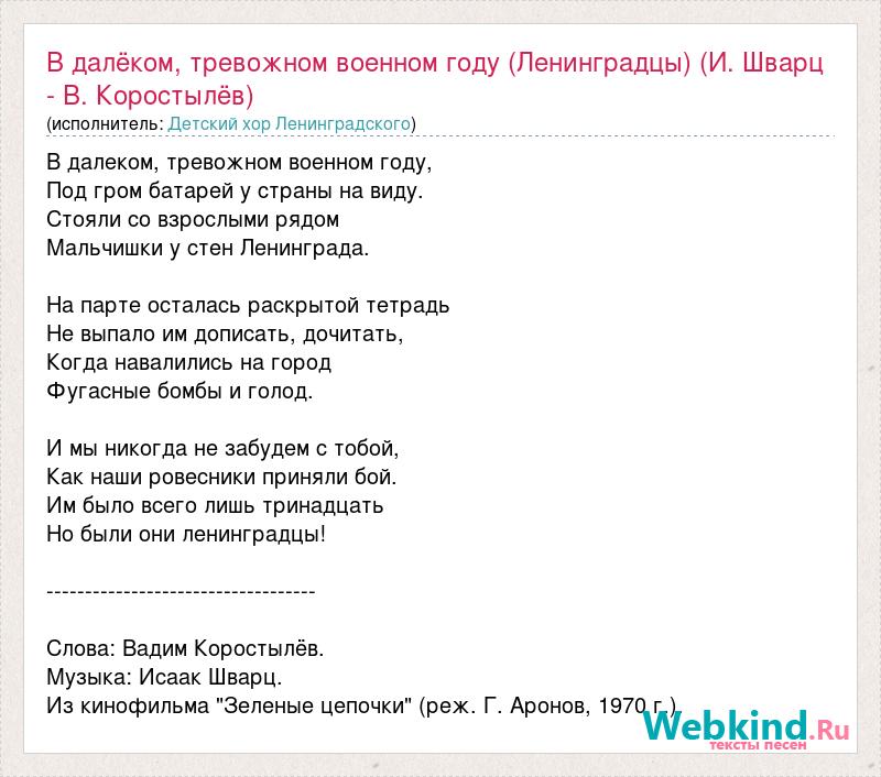В далеком, тревожном военном году, Под гром батарей у страны на виду. Стояли со взрослыми рядом Мальчишки у стен Ленинграда. На парте осталась раскрытой тетрадь Не выпало им дописать, дочитать, Когда навалились на город Фугасные бомбы и голод. И мы никогда не забудем с тобой, Как наши ровесники приняли бой. Им было всего лишь тринадцать Но были они ленинградцы! ----------------------------------- Слова: Вадим Коростылёв. Музыка: Исаак Шварц. Из кинофильма "Зеленые цепочки" (реж. Г. Аронов, 1970 г.).