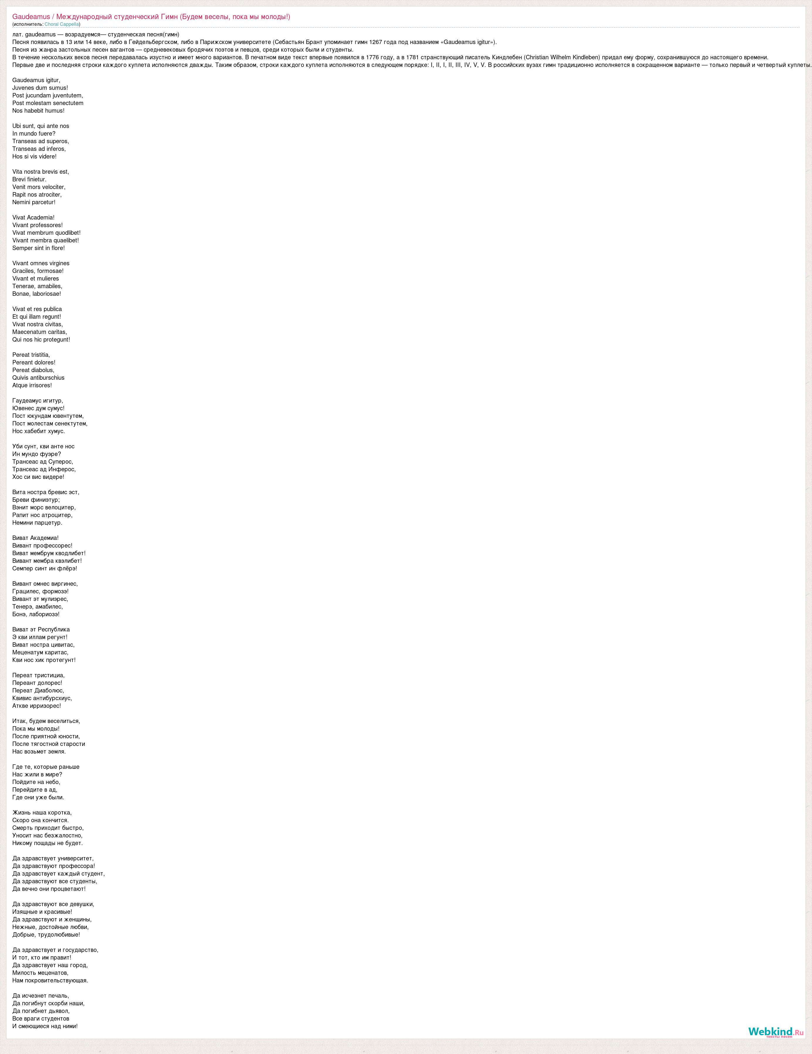 лат. gaudeamus — возрадуемся— студенческая песня(гимн) Песня появилась в 13 или 14 веке, либо в Гейдельбергском, либо в Парижском университете (Себастьян Брант упоминает гимн 1267 года под названием «Gaudeamus igitur»). Песня из жанра застольных песен вагантов — средневековых бродячих поэтов и певцов, среди которых были и студенты. В течение нескольких веков песня передавалась изустно и имеет много вариантов. В печатном виде текст впервые появился в 1776 году, а в 1781 странствующий писатель Киндлебен (Christian Wilhelm Kindleben) придал ему форму, сохранившуюся до настоящего времени. Первые две и последняя строки каждого куплета исполняются дважды. Таким образом, строки каждого куплета исполняются в следующем порядке: I, II, I, II, III, IV, V, V. В российских вузах гимн традиционно исполняется в сокращенном варианте — только первый и четвертый куплеты. Gaudeamus igitur, Juvenes dum sumus! Post jucundam juventutem, Post molestam senectutem Nos habebit humus! Ubi sunt, qui ante nos In mundo fuere? Transeas ad superos, Transeas ad inferos, Hos si vis videre! Vita nostra brevis est, Brevi finietur. Venit mors velociter, Rapit nos atrociter, Nemini parcetur! Vivat Academia! Vivant professores! Vivat membrum quodlibet! Vivant membra quaelibet! Semper sint in flore! Vivant omnes virgines Graciles, formosae! Vivant et mulieres Tenerae, amabiles, Bonae, laboriosae! Vivat et res publica Et qui illam regunt! Vivat nostra civitas, Maecenatum caritas, Qui nos hic protegunt! Pereat tristitia, Pereant dolores! Pereat diabolus, Quivis antiburschius Atque irrisores! Гаудеамус игитур, Ювенес дум сумус! Пост юкундам ювентутем, Пост молестам сенектутем, Нос хабебит хумус. Уби сунт, кви анте нос Ин мундо фуэре? Трансеас ад Суперос, Трансeac ад Инферос, Хос си вис видере! Вита ностра бревис эст, Бреви финиэтур; Вэнит морс велоцитер, Рапит нос атроцитер, Немини парцетур. Виват Академиа! Вивант профессорес! Виват мембрум кводлибет! Вивант мембра квэлибет! Семпер синт ин флёрэ! Вивант омнес виргинес, Грацилес, формозэ! Вивант эт мулиэрес, Тенерэ, амабилес, Бонэ, лабориозэ! Виват эт Республика Э кви иллам регунт! Виват ностра цивитас, Меценатум каритас, Кви нос хик протегунт! Переат тристициа, Переант долорес! Переат Диаболюс, Квивис антибурсхиус, Аткве ирризорес! Итак, будем веселиться, Пока мы молоды! После приятной юности, После тягостной старости Нас возьмет земля. Где те, которые раньше Нас жили в мире? Пойдите на небо, Перейдите в ад, Где они уже были. Жизнь наша коротка, Скоро она кончится. Смерть приходит быстро, Уносит нас безжалостно, Никому пощады не будет. Да здравствует университет, Да здравствуют профессора! Да здравствует каждый студент, Да здравствуют все студенты, Да вечно они процветают! Да здравствуют все девушки, Изящные и красивые! Да здравствуют и женщины, Нежные, достойные любви, Добрые, трудолюбивые! Да здравствует и государство, И тот, кто им правит! Да здравствует наш город, Милость меценатов, Нам покровительствующая. Да исчезнет печаль, Да погибнут скорби наши, Да погибнет дьявол, Все враги студентов И смеющиеся над ними!