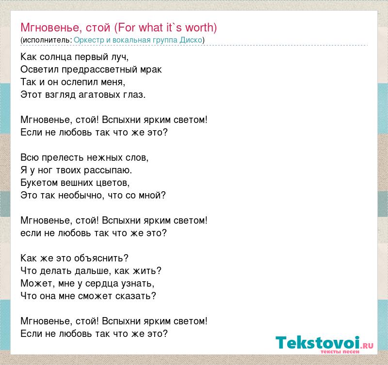 Как солнца первый луч, Осветил предрассветный мрак Так и он ослепил меня, Этот взгляд агатовых глаз. Мгновенье, стой! Вспыхни ярким светом! Если не любовь так что же это? Всю прелесть нежных слов, Я у ног твоих рассыпаю. Букетом вешних цветов, Это так необычно, что со мной? Мгновенье, стой! Вспыхни ярким светом! если не любовь так что же это? Как же это объяснить? Что делать дальше, как жить? Может, мне у сердца узнать, Что она мне сможет сказать? Мгновенье, стой! Вспыхни ярким светом! Если не любовь так что же это?
