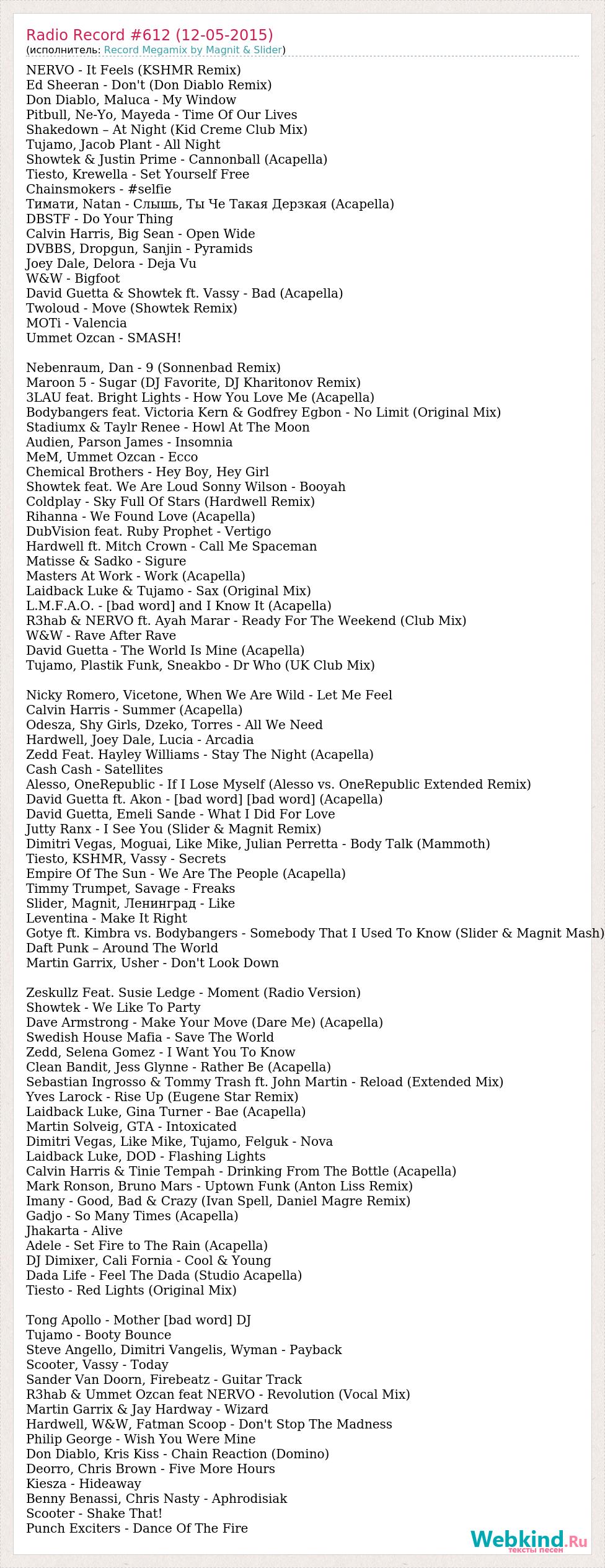 NERVO - It Feels (KSHMR Remix) Ed Sheeran - Don't (Don Diablo Remix) Don Diablo, Maluca - My Window Pitbull, Ne-Yo, Mayeda - Time Of Our Lives Shakedown – At Night (Kid Creme Club Mix) Tujamo, Jacob Plant - All Night Showtek & Justin Prime - Cannonball (Acapella) Tiesto, Krewella - Set Yourself Free Chainsmokers - #selfie Тимати, Natan - Слышь, Ты Че Такая Дерзкая (Acapella) DBSTF - Do Your Thing Calvin Harris, Big Sean - Open Wide DVBBS, Dropgun, Sanjin - Pyramids Joey Dale, Delora - Deja Vu W&W - Bigfoot David Guetta & Showtek ft. Vassy - Bad (Acapella) Twoloud - Move (Showtek Remix) MOTi - Valencia Ummet Ozcan - SMASH! Nebenraum, Dan - 9 (Sonnenbad Remix) Maroon 5 - Sugar (DJ Favorite, DJ Kharitonov Remix) 3LAU feat. Bright Lights - How You Love Me (Acapella) Bodybangers feat. Victoria Kern & Godfrey Egbon - No Limit (Original Mix) Stadiumx & Taylr Renee - Howl At The Moon Audien, Parson James - Insomnia MeM, Ummet Ozcan - Ecco Chemical Brothers - Hey Boy, Hey Girl Showtek feat. We Are Loud Sonny Wilson - Booyah Coldplay - Sky Full Of Stars (Hardwell Remix) Rihanna - We Found Love (Acapella) DubVision feat. Ruby Prophet - Vertigo Hardwell ft. Mitch Crown - Call Me Spaceman Matisse & Sadko - Sigure Masters At Work - Work (Acapella) Laidback Luke & Tujamo - Sax (Original Mix) L.M.F.A.O. - [bad word] and I Know It (Acapella) R3hab & NERVO ft. Ayah Marar - Ready For The Weekend (Club Mix) W&W - Rave After Rave David Guetta - The World Is Mine (Acapella) Tujamo, Plastik Funk, Sneakbo - Dr Who (UK Club Mix) Nicky Romero, Vicetone, When We Are Wild - Let Me Feel Calvin Harris - Summer (Acapella) Odesza, Shy Girls, Dzeko, Torres - All We Need Hardwell, Joey Dale, Lucia - Arcadia Zedd Feat. Hayley Williams - Stay The Night (Acapella) Cash Cash - Satellites Alesso, OneRepublic - If I Lose Myself (Alesso vs. OneRepublic Extended Remix) David Guetta ft. Akon - [bad word] [bad word] (Acapella) David Guetta, Emeli Sande - What I Did For Love Jutty Ranx - I See You (Slider & Magnit Remix) Dimitri Vegas, Moguai, Like Mike, Julian Perretta - Body Talk (Mammoth) Tiesto, KSHMR, Vassy - Secrets Empire Of The Sun - We Are The People (Acapella) Timmy Trumpet, Savage - Freaks Slider, Magnit, Ленинград - Like Leventina - Make It Right Gotye ft. Kimbra vs. Bodybangers - Somebody That I Used To Know (Slider & Magnit Mash) Daft Punk – Around The World Martin Garrix, Usher - Don't Look Down Zeskullz Feat. Susie Ledge - Moment (Radio Version) Showtek - We Like To Party Dave Armstrong - Make Your Move (Dare Me) (Acapella) Swedish House Mafia - Save The World Zedd, Selena Gomez - I Want You To Know Clean Bandit, Jess Glynne - Rather Be (Acapella) Sebastian Ingrosso & Tommy Trash ft. John Martin - Reload (Extended Mix) Yves Larock - Rise Up (Eugene Star Remix) Laidback Luke, Gina Turner - Bae (Acapella) Martin Solveig, GTA - Intoxicated Dimitri Vegas, Like Mike, Tujamo, Felguk - Nova Laidback Luke, DOD - Flashing Lights Calvin Harris & Tinie Tempah - Drinking From The Bottle (Acapella) Mark Ronson, Bruno Mars - Uptown Funk (Anton Liss Remix) Imany - Good, Bad & Crazy (Ivan Spell, Daniel Magre Remix) Gadjo - So Many Times (Acapella) Jhakarta - Alive Adele - Set Fire to The Rain (Acapella) DJ Dimixer, Cali Fornia - Cool & Young Dada Life - Feel The Dada (Studio Acapella) Tiesto - Red Lights (Original Mix) Tong Apollo - Mother [bad word] DJ Tujamo - Booty Bounce Steve Angello, Dimitri Vangelis, Wyman - Payback Scooter, Vassy - Today Sander Van Doorn, Firebeatz - Guitar Track R3hab & Ummet Ozcan feat NERVO - Revolution (Vocal Mix) Martin Garrix & Jay Hardway - Wizard Hardwell, W&W, Fatman Scoop - Don't Stop The Madness Philip George - Wish You Were Mine Don Diablo, Kris Kiss - Chain Reaction (Domino) Deorro, Chris Brown - Five More Hours Kiesza - Hideaway Benny Benassi, Chris Nasty - Aphrodisiak Scooter - Shake That! Punch Exciters - Dance Of The Fire
