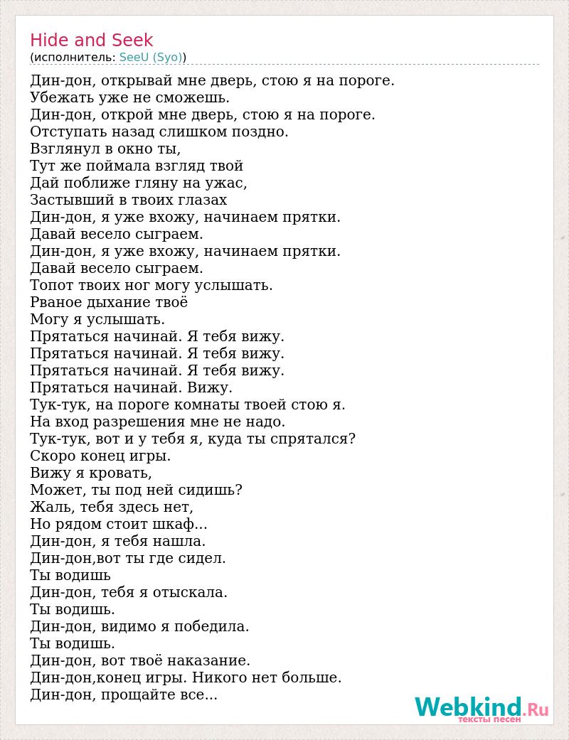 Дин-дон, открывай мне дверь, стою я на пороге. Убежать уже не сможешь. Дин-дон, открой мне дверь, стою я на пороге. Отступать назад слишком поздно. Взглянул в окно ты, Тут же поймала взгляд твой Дай поближе гляну на ужас, Застывший в твоих глазах Дин-дон, я уже вхожу, начинаем прятки. Давай весело сыграем. Дин-дон, я уже вхожу, начинаем прятки. Давай весело сыграем. Топот твоих ног могу услышать. Рваное дыхание твоё Могу я услышать. Прятаться начинай. Я тебя вижу. Прятаться начинай. Я тебя вижу. Прятаться начинай. Я тебя вижу. Прятаться начинай. Вижу. Тук-тук, на пороге комнаты твоей стою я. На вход разрешения мне не надо. Тук-тук, вот и у тебя я, куда ты спрятался? Скоро конец игры. Вижу я кровать, Может, ты под ней сидишь? Жаль, тебя здесь нет, Но рядом стоит шкаф... Дин-дон, я тебя нашла. Дин-дон,вот ты где сидел. Ты водишь Дин-дон, тебя я отыскала. Ты водишь. Дин-дон, видимо я победила. Ты водишь. Дин-дон, вот твоё наказание. Дин-дон,конец игры. Никого нет больше. Дин-дон, прощайте все...