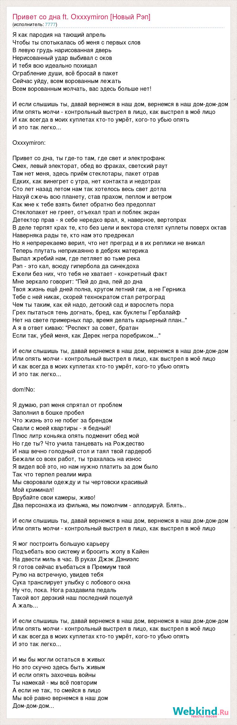 Я как пародия на тающий апрель Чтобы ты спотыкалась об меня с первых слов В левую грудь нарисованная дверь Нерисованный удар выбивал с оков И тебя всю идеально похищал Ограбление души, всё бросай в пакет Сейчас уйду, всем ворованным лежать Всем ворованным молчать, вас здесь больше нет! И если слышишь ты, давай вернемся в наш дом, вернемся в наш дом-дом-дом Или опять молчи - контрольный выстрел в лицо, как выстрел в моё лицо И как всегда в моих куплетах кто-то умрёт, кого-то убью опять И это так легко... Oxxxymiron: Привет со дна, ты где-то там, где свет и электрофанк Смех, левый электорат, обед во фраках, светский раут Там нет меня, здесь приём стеклотары, пакет отрав Едких, как винегрет с утра, нет контакта и недотрах Сто лет назад летом нам так хотелось весь свет дотла Нахуй сжечь всю планету, став прахом, пеплом и ветром Как мне к тебе взять билет обратно без предоплат Стеклопакет не греет, отъехал трап и поблек экран Детектор прав - я себе нередко врал, я, наверное, вертопрах В деле терпят крах те, кто без цели и вектора стелят куплеты поверх октав Наверняка рады те, кто нам это предрекал Но я непререкаемо верил, что нет преград и в их реплики не вникал Теперь плутать неприкаянно в дебрях материка Выпал жребий нам, где петляет во тьме река Рэп - это кал, всюду гипербола да синекдоха Ежели без них, что тебя не хватает - конкретный факт Мне зеркало говорит: "Пей до дна, пей до дна Твоя жизнь ещё дней полна, кругом летний гам, а не Герника Тебе с ней никак, скорей технократом стал ретроград Чем ты таким, как ей надо, детский сад и взрослеть пора Грех пытаться тень догнать, бред, как буклеты Гербалайф Нет на свете примерных пар, время делать карьерный план.." А я в ответ киваю: "Респект за совет, братан Если так, убей меня, как Дерек негра поребриком..." И если слышишь ты, давай вернемся в наш дом, вернемся в наш дом-дом-дом Или опять молчи - контрольный выстрел в лицо, как выстрел в моё лицо И как всегда в моих куплетах кто-то умрёт, кого-то убью опять И это так легко... dom!No: Я думаю, рэп меня спрятал от проблем Заполнил в бошке пробел Что жизнь это не побег за брендом Свали с моей квартиры - я бедный! Плюс литр коньяка опять подменит обед мой Но где ты? Что учила танцевать на Рождество И наш вечно голодный стол и таял твой гардероб Бежали со всех работ, ты трахалась на износ Я видел всё это, но нам нужно платить за дом было Так что терпел реалии мира Мы своровали одежду и ты чертовски красивый Мой криминал! Врубайте свои камеры, живо! Два персонажа из фильма, мы помолчим - аплодируй. Блять.. И если слышишь ты, давай вернемся в наш дом, вернемся в наш дом-дом-дом Или опять молчи - контрольный выстрел в лицо, как выстрел в моё лицо Я мог построить большую карьеру Подъебать всю систему и бросить жопу в Кайен На двести миль в час. В руках Джэк Дэниэлс Я готов сейчас въебаться в Премиум твой Рулю на встречную, увидев тебя Сука транслирует улыбку с лобового окна Ну что, пока. Нога раздавила педаль Такой вот дерзкий наш последний поцелуй А жаль... И если слышишь ты, давай вернемся в наш дом, вернемся в наш дом-дом-дом Или опять молчи - контрольный выстрел в лицо, как выстрел в моё лицо И как всегда в моих куплетах кто-то умрёт, кого-то убью опять И это так легко... И мы бы могли остаться в живых Но это скучно здесь быть живым И если опять захочешь войны Ты намекай - мы всё повторим А если не так, то смейся 