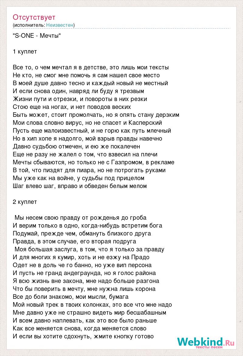 "S-ONE - Мечты" 1 куплет Все то, о чем мечтал я в детстве, это лишь мои тексты Не кто, не смог мне помочь я сам нашел свое место В моей душе давно тесно и каждый новый не местный И если снова один, навряд ли буду я трезвым Жизни пути и отрезки, и повороты в них резки Стою еще на ногах, и нет поводов веских Быть может, стоит промолчать, но я опять стану дерзким Мои слова словно вирус, но не спасет и Касперский Пусть еще малоизвестный, и не горю как путь млечный Но в хип хопе я надолго, мой взрыв правды навечно Давно судьбою отмечен, и ею же покалечен Еще не разу не жалел о том, что взвесил на плечи Мечты сбываются, но только не с Газпромом, в рекламе В той, что пиздят для пиара, но не потрогать руками Мы уже как на войне, у судьбы под прицелом Шаг влево шаг, вправо и обведен белым мелом 2 куплет Мы несем свою правду от рожденья до гроба И верим только в одно, когда-нибудь встретим бога Подумай, прежде чем, обмануть близкого друга Правда, в этом случае, его вторая подруга Моя большая заслуга, в том, что я только за правду И для многих я кумир, хоть и не езжу на Прадо Одет не в доль че го банно, но уже вип персона И пусть не гранд андеграунда, но я голос района Я всю жизнь вне закона, мне надо больше разгона Что бы поверить в мечту, мне нужна лишь корона Все до боли знакомо, мои мысли, бумага Мой новый трек в твоих колонках, это все что мне надо Мне давно уже не страшно видеть мир бесшабашным И всем давно наплевать, как это все было раньше Как все меняется снова, когда меняется слово И если вы хотите сдохнуть, жмите кнопку готово