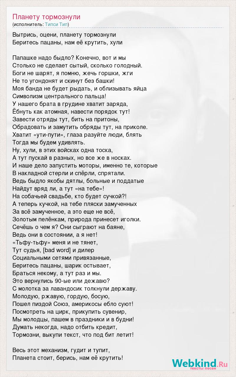 Вытрись, оцени, планету тормознули Беритесь пацаны, нам её крутить, хули Папашке надо быдло? Конечно, вот и мы Столько не сделает сытый, сколько голодный. Боги не шарят, я помню, жечь горшки, жги Не то угондонят и скинут без башки! Моя банда не будет рыдать, и облизывать яйца Символизм центрального пальца! У нашего брата в грудине хватит заряда, Ёбнуть как атомная, навести порядок тут! Завести отряды тут, бить на притоны, Обрадовать и замутить обряды тут, на приколе. Хватит «ути-пути», глаза разуйте люди, блять Тогда мы будем удивлять. Ну, хули, в этих войсках одна тоска, А тут пускай в разных, но все же в носках. И наше дело запустить моторы, именно те, которые В накладной стерли и спёрли, спрятали. Ведь быдло якобы дятлы, больные и поддатые Найдут вряд ли, а тут «на тебе»! На собачьей свадьбе, кто будет сучкой?! А теперь кучкой, на тебе пляски замученных За всё замученное, а это еще не всё, Золотым пелёнкам, природа принесет иголки. Сечёшь о чем я? Они сыграют на баяне, Ведь они в состоянии, а я нет! «Тьфу-тьфу» меня и не тянет, Тут судья, [bad word] и дилер Социальными сетями привязанные, Беритесь пацаны, шарик остывает, Браться некому, а тут раз и мы. Это вернулись 90-ые или дежавю? С молотка за лавандосик толкнули державу. Молодую, ржавую, гордую, босую, Пошел пиздой Союз, америкосы ебло суют! Посмотреть на цирк, прикупить сувенир, Мы молодцы, пашем в праздники и в будни! Думать некогда, надо отбить кредит, Тормозни, выкупи текст, что под бит летит! Весь этот механизм, гудит и тупит, Планета стоит, берись, нам её крутить!
