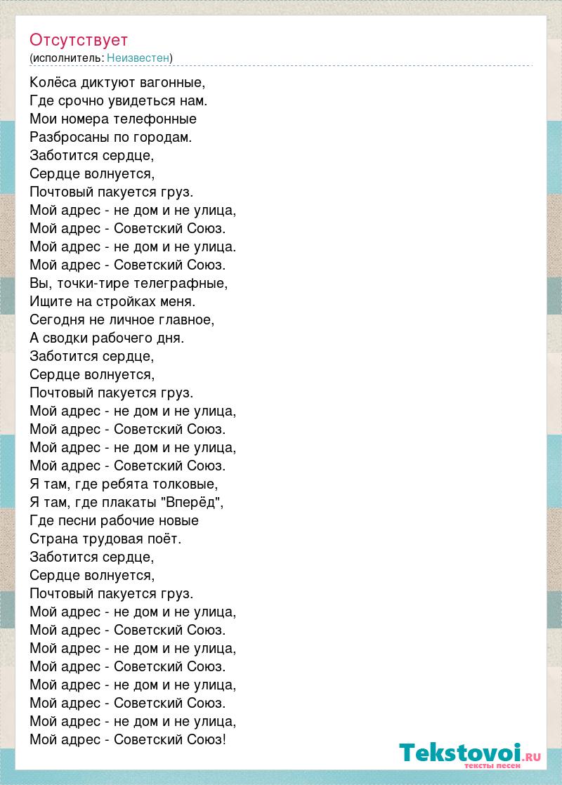 Колёса диктуют вагонные, Где срочно увидеться нам. Мои номера телефонные Разбросаны по городам. Заботится сердце, Сердце волнуется, Почтовый пакуется груз. Мой адрес - не дом и не улица, Мой адрес - Советский Союз. Мой адрес - не дом и не улица. Мой адрес - Советский Союз. Вы, точки-тире телеграфные, Ищите на стройках меня. Сегодня не личное главное, А сводки рабочего дня. Заботится сердце, Сердце волнуется, Почтовый пакуется груз. Мой адрес - не дом и не улица, Мой адрес - Советский Союз. Мой адрес - не дом и не улица, Мой адрес - Советский Союз. Я там, где ребята толковые, Я там, где плакаты "Вперёд", Где песни рабочие новые Страна трудовая поёт. Заботится сердце, Сердце волнуется, Почтовый пакуется груз. Мой адрес - не дом и не улица, Мой адрес - Советский Союз. Мой адрес - не дом и не улица, Мой адрес - Советский Союз. Мой адрес - не дом и не улица, Мой адрес - Советский Союз. Мой адрес - не дом и не улица, Мой адрес - Советский Союз!