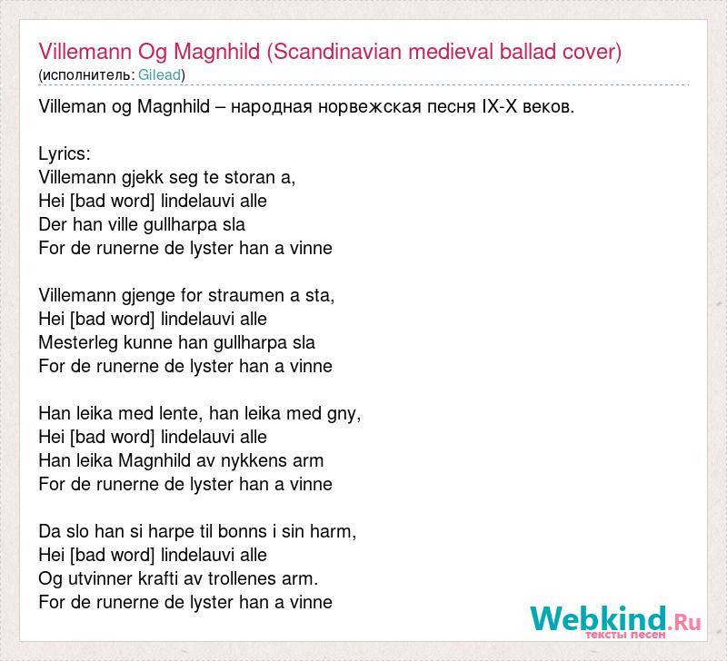 Villeman og Magnhild – народная норвежская песня IX-X веков. Lyrics: Villemann gjekk seg te storan a, Hei [bad word] lindelauvi alle Der han ville gullharpa sla For de runerne de lyster han a vinne Villemann gjenge for straumen a sta, Hei [bad word] lindelauvi alle Mesterleg kunne han gullharpa sla For de runerne de lyster han a vinne Han leika med lente, han leika med gny, Hei [bad word] lindelauvi alle Han leika Magnhild av nykkens arm For de runerne de lyster han a vinne Da slo han si harpe til bonns i sin harm, Hei [bad word] lindelauvi alle Og utvinner krafti av trollenes arm. For de runerne de lyster han a vinne
