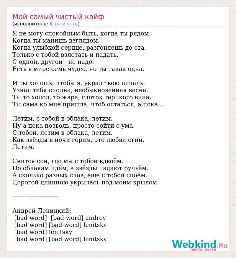 Я не могу спокойным быть, когда ты рядом. Когда ты манишь взглядом. Когда улыбкой сердце, разгоняешь до ста. Только с тобой взлетать и падать. С одной, другой - не надо. Есть в мире семь чудес, но ты такая одна. И ты хочешь, чтобы я, украл твою печаль. Узнал тебя сполна, необыкновенная весна. Ты то холод, то жара, глоток терпкого вина. Ты сама ко мне пришла, чтоб остаться, а пока... Летим, с тобой в облака, летим. Ну а пока позволь, просто сойти с ума. С тобой, летим в облака, летим. Как звёзды в ночи горим, это любви огни. Летим. Снится сон, где мы с тобой вдвоём. По облакам идём, а звёзды падают ручьём. А сколько разных слов, еще с тобой споём. Дорогой длинною укрылась под моим крылом. ----------------------- Андрей Леницкий: [bad word] [bad word] andrey [bad word] [bad word] lenitsky [bad word] lenitsky [bad word] [bad word] lenitsky