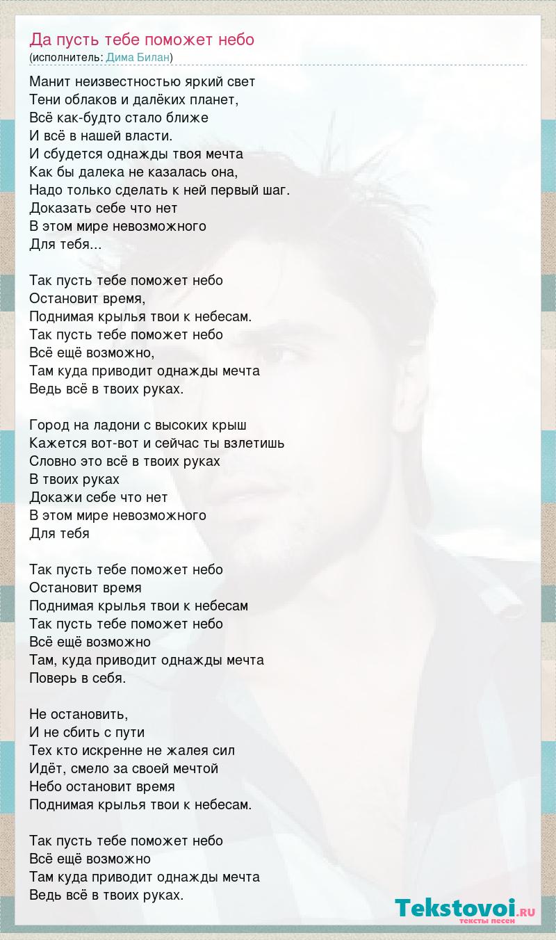 Манит неизвестностью яркий свет Тени облаков и далёких планет, Всё как-будто стало ближе И всё в нашей власти. И сбудется однажды твоя мечта Как бы далека не казалась она, Надо только сделать к ней первый шаг. Доказать себе что нет В этом мире невозможного Для тебя... Так пусть тебе поможет небо Остановит время, Поднимая крылья твои к небесам. Так пусть тебе поможет небо Всё ещё возможно, Там куда приводит однажды мечта Ведь всё в твоих руках. Город на ладони с высоких крыш Кажется вот-вот и сейчас ты взлетишь Словно это всё в твоих руках В твоих руках Докажи себе что нет В этом мире невозможного Для тебя Так пусть тебе поможет небо Остановит время Поднимая крылья твои к небесам Так пусть тебе поможет небо Всё ещё возможно Там, куда приводит однажды мечта Поверь в себя. Не остановить, И не сбить с пути Тех кто искренне не жалея сил Идёт, смело за своей мечтой Небо остановит время Поднимая крылья твои к небесам. Так пусть тебе поможет небо Всё ещё возможно Там куда приводит однажды мечта Ведь всё в твоих руках.