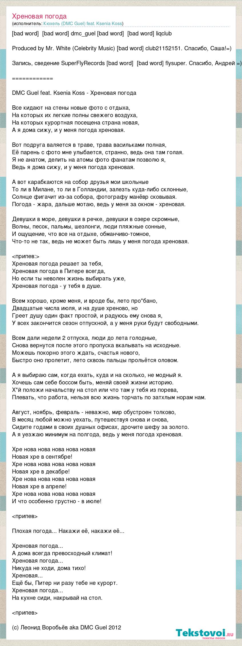 [bad word] [bad word] dmc_guel [bad word] [bad word] liqclub Produced by Mr. White (Celebrity Music) [bad word] club21152151. Спасибо, Саша!=) Запись, сведение SuperFlyRecords [bad word] [bad word] flysuper. Спасибо, Андрей =) ============ DMC Guel feat. Ksenia Koss - Хреновая погода Все кидают на стены новые фото с отдыха, На которых их легкие полны свежего воздуха, На которых курортная посещена страна новая, А я дома сижу, и у меня погода хреновая. Вот подруга валяется в траве, трава васильками полная, Её парень с фото мне улыбается, странно, ведь она там голая. Я не анатом, делить на атомы фото фанатам позволю я, Ведь я дома сижу, и у меня погода хреновая. А вот карабкаются на собор друзья мои школьные То ли в Милане, то ли в Голландии, залезть куда-либо склонные, Солнце фигачит из-за собора, фотографу манёвр сковывая. Погода - жара, дальше мотаю, ведь у меня за окном - хреновая. Девушки в море, девушки в речке, девушки в озере скромные, Волны, песок, пальмы, шезлонги, люди пляжные сонные, И ощущение, что все на отдыхе, обманчиво-томное, Что-то не так, ведь не может быть лишь у меня погода хреновая. <припев:> Хреновая погода решает за тебя, Хреновая погода в Питере всегда, Но если ты неволен жизнь выбирать уже, Хреновая погода - у тебя в душе. Всем хорошо, кроме меня, и вроде бы, лето про*бано, Двадцатые числа июля, и на душе хреново, но Греет душу один факт простой, и радуюсь ему снова я, У всех закончится сезон отпускной, а у меня руки будут свободными. Всем дали недели 2 отпуска, люди до лета голодные, Снова вернутся после этого пропуска вкалывать на исходные. Можешь покорно этого ждать, счастья нового, Быстро оно пролетит, лето сквозь пальцы прольётся оловом. А я выбираю сам, когда ехать, куда и на сколько, не модный я. Хочешь сам себе боссом быть, меняй своей жизни историю. Х*й положи начальству на стол или что там у тебя из порева, Плевать, что работа, нельзя всю жизнь торчать по затхлым норам нам. Август, ноябрь, февраль - неважно, мир обустроен толково, В месяц любой можно уехать, путешествуя снова и снова, Сидите годами в своих душных офисах, дрочите шефу за золото. А я уезжаю минимум на полгода, ведь у меня погода хреновая. Хре нова нова нова нова новая Новая хре в сентябре! Хре нова нова нова нова новая Новая хре в декабре! Хре нова нова нова нова новая Новая хре в апреле! Хре нова нова нова нова новая И что особенно грустно - в июле! <припев> Плохая погода... Накажи её, накажи её... Хреновая погода... А дома всегда превосходный климат! Хреновая погода... Никуда не ходи, дома тихо! Хреновая... Ещё бы, Питер ни разу тебе не курорт. Хреновая погода... На кухне сиди, накрывай на стол. <припев> (c) Леонид Воробьёв aka DMC Guel 2012