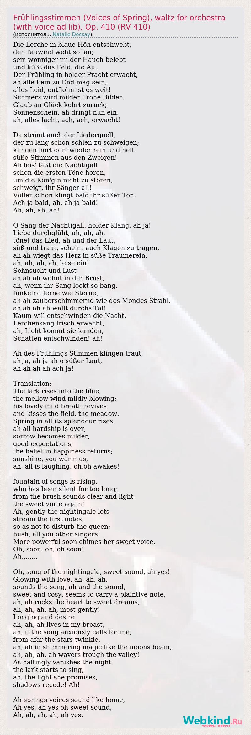 Die Lerche in blaue Höh entschwebt, der Tauwind weht so lau; sein wonniger milder Hauch belebt und küßt das Feld, die Au. Der Frühling in holder Pracht erwacht, ah alle Pein zu End mag sein, alles Leid, entflohn ist es weit! Schmerz wird milder, frohe Bilder, Glaub an Glück kehrt zuruck; Sonnenschein, ah dringt nun ein, ah, alles lacht, ach, ach, erwacht! Da strömt auch der Liederquell, der zu lang schon schien zu schweigen; klingen hört dort wieder rein und hell süße Stimmen aus den Zweigen! Ah leis' läßt die Nachtigall schon die ersten Töne horen, um die Kön'gin nicht zu stören, schweigt, ihr Sänger all! Voller schon klingt bald ihr süßer Ton. Ach ja bald, ah, ah ja bald! Ah, ah, ah, ah! O Sang der Nachtigall, holder Klang, ah ja! Liebe durchglüht, ah, ah, ah, tönet das Lied, ah und der Laut, süß und traut, scheint auch Klagen zu tragen, ah ah wiegt das Herz in süße Traumerein, ah, ah, ah, ah, leise ein! Sehnsucht und Lust ah ah ah wohnt in der Brust, ah, wenn ihr Sang lockt so bang, funkelnd ferne wie Sterne, ah ah zauberschimmernd wie des Mondes Strahl, ah ah ah ah wallt durchs Tal! Kaum will entschwinden die Nacht, Lerchensang frisch erwacht, ah, Licht kommt sie kunden, Schatten entschwinden! ah! Ah des Frühlings Stimmen klingen traut, ah ja, ah ja ah o süßer Laut, ah ah ah ah ach ja! Translation: The lark rises into the blue, the mellow wind mildly blowing; his lovely mild breath revives and kisses the field, the meadow. Spring in all its splendour rises, ah all hardship is over, sorrow becomes milder, good expectations, the belief in happiness returns; sunshine, you warm us, ah, all is laughing, oh,oh awakes! fountain of songs is rising, who has been silent for too long; from the brush sounds clear and light the sweet voice again! Ah, gently the nightingale lets stream the first notes, so as not to disturb the queen; hush, all you other singers! More powerful soon chimes her sweet voice. Oh, soon, oh, oh soon! Ah........ Oh, song of the nightingale, sweet sound, ah yes! Glowing with love, ah, ah, ah, sounds the song, ah and the sound, sweet and cosy, seems to carry a plaintive note, ah, ah rocks the heart to sweet dreams, ah, ah, ah, ah, most gently! Longing and desire ah, ah, ah lives in my breast, ah, if the song anxiously calls for me, from afar the stars twinkle, ah, ah in shimmering magic like the moons beam, ah, ah, ah, ah wavers trough the valley! As haltingly vanishes the night, the lark starts to sing, ah, the light she promises, shadows recede! Ah! Ah springs voices sound like home, Ah yes, ah yes oh sweet sound, Ah, ah, ah, ah, ah yes.