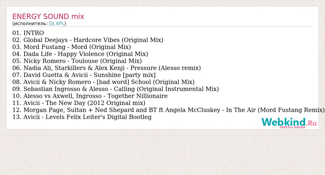 01. INTRO 02. Global Deejays - Hardcore Vibes (Original Mix) 03. Mord Fustang - Mord (Original Mix) 04. Dada Life - Happy Violence (Original Mix) 05. Nicky Romero - Toulouse (Original Mix) 06. Nadia Ali, Starkillers & Alex Kenji - Pressure (Alesso remix) 07. David Guetta & Avicii - Sunshine [party mix] 08. Avicii & Nicky Romero - [bad word] School (Original Mix) 09. Sebastian Ingrosso & Alesso - Calling (Original Instrumental Mix) 10. Alesso vs Axwell, Ingrosso - Together Nillionaire 11. Avicii - The New Day (2012 Original mix) 12. Morgan Page, Sultan + Ned Shepard and BT ft Angela McCluskey - In The Air (Mord Fustang Remix) 13. Avicii - Levels Felix Leiter's Digital Bootleg