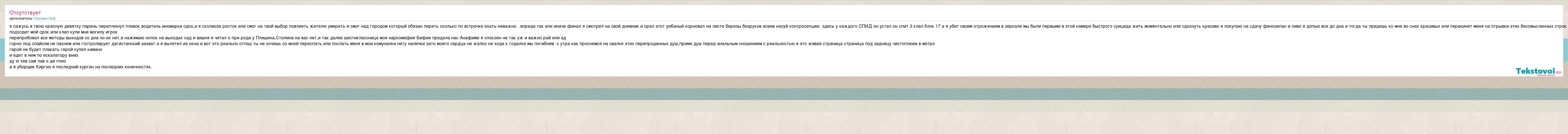 я сажусь в твою красную девятку парень переплюнул плевок водитель иномарки сдох,а я сколиоза росток или смог на твой выбор повлиять жителю умереть я смог над городом который обязан переть сколько по встречке ехать-неважно . впреди так или иначе финал я смотрел на свой дневник и орал этот уебаный корновал на листе березы безруков есеев нахуй контросепцию здесь у каждого СПИД он устал он спит 3 клал блок 17 а я убит своим отрожением в зеркале мы были первыми в этой камере быстрого суицида жить моментально или сдохнуть красиво я покупаю на сдачу фенозепан и пиво я допью все до дна и тогда ты придешь ко мне во снах красивых или перекинет меня на отрывки этих бессмысленных строк подходит мой срок или клап купи мне могилу игрок перепробовал все методы выходов со дна но их нет,я нажимаю онлок на выходах сад и вишня я читал о при роде у Плишина,Сталина на вас нет,и так далее шестиклассница моя наркомафия Бифия предала нас Анафиме я спокоен не так уж и важно рай или ад горно под спайсом не пахнем или гостролирует дагистанский захват а я вылетел из окна и вот это реально отпад ты не хочешь со мной переспать или послать меня в мои комуналки нету налички зато моего сердца не жалко не ходи к годалке мы погибнем с утра как проснемся на свалке этих перепроданных душ,прими душ перед анальным сношением с реальностью я это живая страница страница под задницу чистоплюев в метро герой не будет плакать герой купил кимано и едет в нем по ескалатору вниз ду ю хев сам лав о де плиз а я уборщик Киргиз я последний курган на последних конечностях.