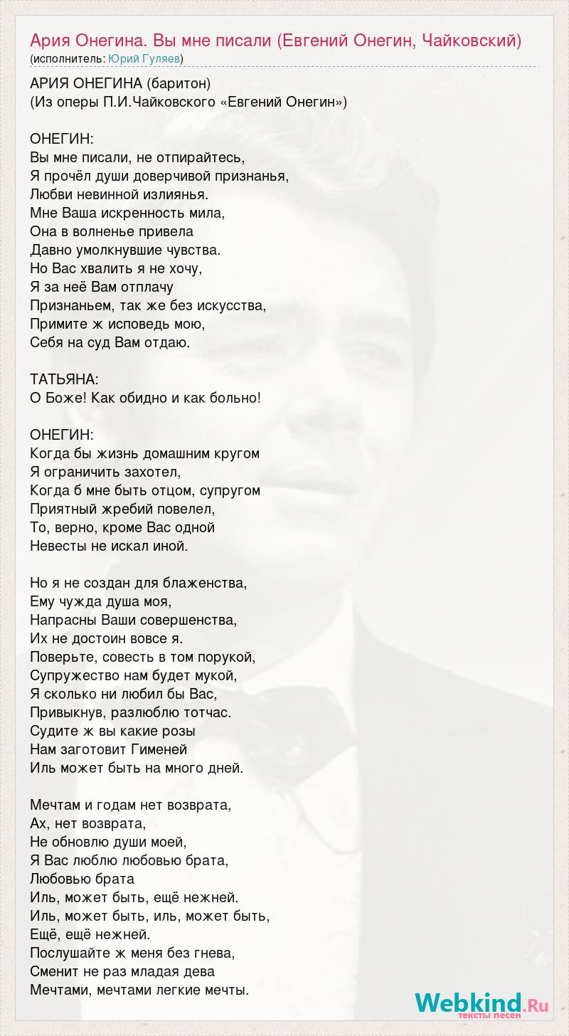 А как ты думаешь, о чем песня "Ария Онегина. Вы мне писали (Евгений Онегин, Чайковский)" ?