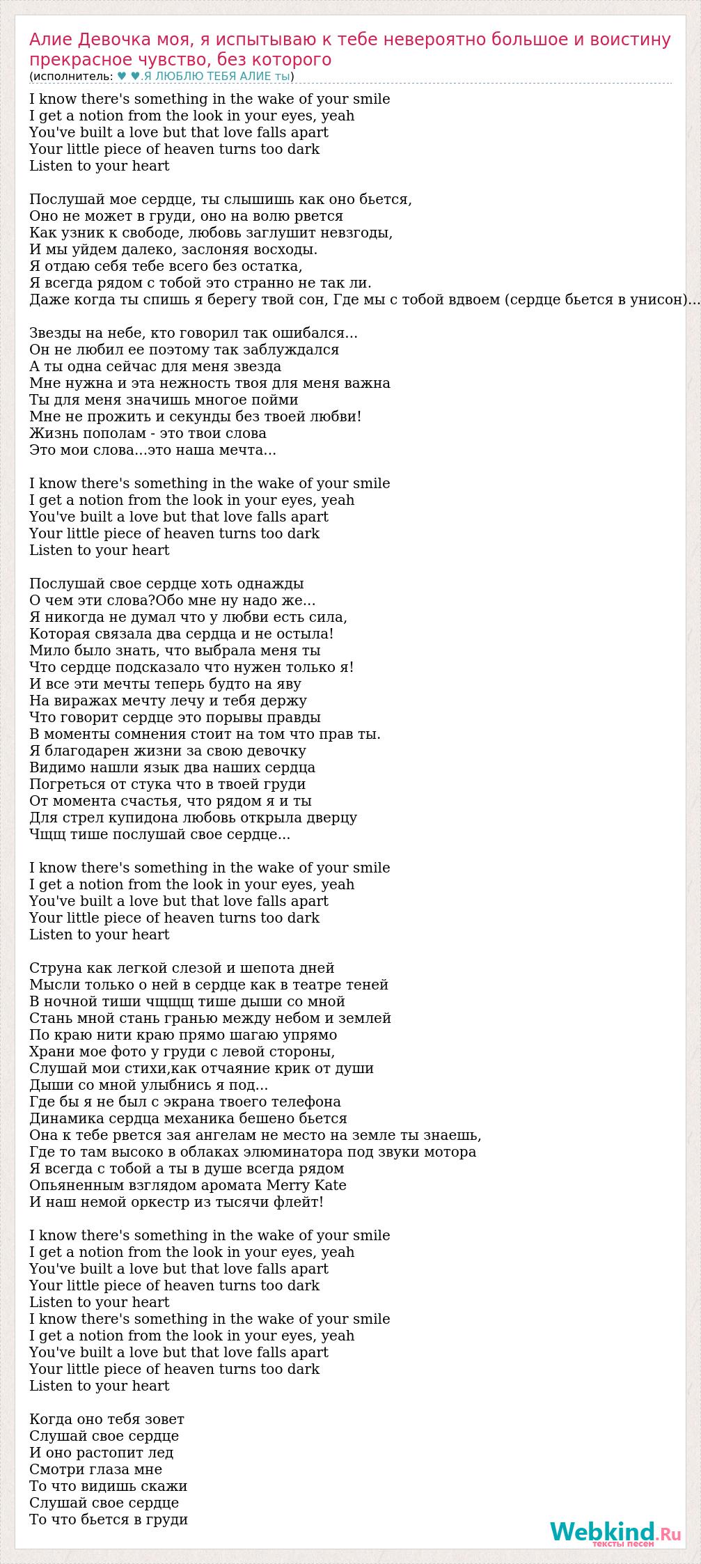 I know there's something in the wake of your smile I get a notion from the look in your eyes, yeah You've built a love but that love falls apart Your little piece of heaven turns too dark Listen to your heart Послушай мое сердце, ты слышишь как оно бьется, Оно не может в груди, оно на волю рвется Как узник к свободе, любовь заглушит невзгоды, И мы уйдем далеко, заслоняя восходы. Я отдаю себя тебе всего без остатка, Я всегда рядом с тобой это странно не так ли. Даже когда ты спишь я берегу твой сон, Где мы с тобой вдвоем (сердце бьется в унисон)... Звезды на небе, кто говорил так ошибался... Он не любил ее поэтому так заблуждался А ты одна сейчас для меня звезда Мне нужна и эта нежность твоя для меня важна Ты для меня значишь многое пойми Мне не прожить и секунды без твоей любви! Жизнь пополам - это твои слова Это мои слова...это наша мечта... I know there's something in the wake of your smile I get a notion from the look in your eyes, yeah You've built a love but that love falls apart Your little piece of heaven turns too dark Listen to your heart Послушай свое сердце хоть однажды О чем эти слова?Обо мне ну надо же... Я никогда не думал что у любви есть сила, Которая связала два сердца и не остыла! Мило было знать, что выбрала меня ты Что сердце подсказало что нужен только я! И все эти мечты теперь будто на яву На виражах мечту лечу и тебя держу Что говорит сердце это порывы правды В моменты сомнения стоит на том что прав ты. Я благодарен жизни за свою девочку Видимо нашли язык два наших сердца Погреться от стука что в твоей груди От момента счастья, что рядом я и ты Для стрел купидона любовь открыла дверцу Чщщ тише послушай свое сердце... I know there's something in the wake of your smile I get a notion from the look in your eyes, yeah You've built a love but that love falls apart Your little piece of heaven turns too dark Listen to your heart Струна как легкой слезой и шепота дней Мысли только о ней в сердце как в театре теней В ночной тиши чщщщ тише дыши со мной Стань мной стань гранью между небом и землей По краю нити краю прямо шагаю упрямо Храни мое фото у груди с левой стороны, Слушай мои стихи,как отчаяние крик от души Дыши со мной улыбнись я под... Где бы я не был с экрана твоего телефона Динамика сердца механика бешено бьется Она к тебе рвется зая ангелам не место на земле ты знаешь, Где то там высоко в облаках элюминатора под звуки мотора Я всегда с тобой а ты в душе всегда рядом Опьяненным взглядом аромата Merry Kate И наш немой оркестр из тысячи флейт! I know there's something in the wake of your smile I get a notion from the look in your eyes, yeah You've built a love but that love falls apart Your little piece of heaven turns too dark Listen to your heart I know there's something in the wake of your smile I get a notion from the look in your eyes, yeah You've built a love but that love falls apart Your little piece of heaven turns too dark Listen to your heart Когда оно тебя зовет Слушай свое сердце И оно растопит лед Смотри глаза мне То что видишь скажи Слушай свое сердце То что бьется в груди