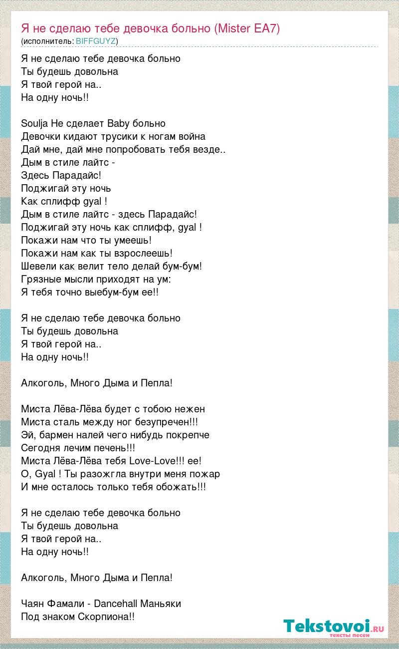 Я не сделаю тебе девочка больно Ты будешь довольна Я твой герой на.. На одну ночь!! Soulja Не сделает Baby больно Девочки кидают трусики к ногам война Дай мне, дай мне попробовать тебя везде.. Дым в стиле лайтс - Здесь Парадайс! Поджигай эту ночь Как сплифф gyal ! Дым в стиле лайтс - здесь Парадайс! Поджигай эту ночь как сплифф, gyal ! Покажи нам что ты умеешь! Покажи нам как ты взрослеешь! Шевели как велит тело делай бум-бум! Грязные мысли приходят на ум: Я тебя точно выебум-бум ее!! Я не сделаю тебе девочка больно Ты будешь довольна Я твой герой на.. На одну ночь!! Алкоголь, Много Дыма и Пепла! Миста Лёва-Лёва будет с тобою нежен Миста сталь между ног безупречен!!! Эй, бармен налей чего нибудь покрепче Сегодня лечим печень!!! Миста Лёва-Лёва тебя Love-Love!!! ее! O, Gyal ! Ты разожгла внутри меня пожар И мне осталось только тебя обожать!!! Я не сделаю тебе девочка больно Ты будешь довольна Я твой герой на.. На одну ночь!! Алкоголь, Много Дыма и Пепла! Чаян Фамали - Dancehall Маньяки Под знаком Скорпиона!!