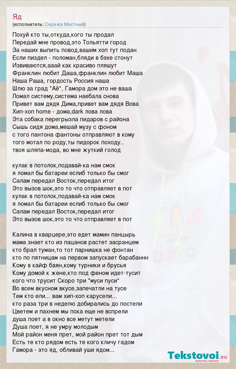 Похуй кто ты,откуда,кого ты продал Передай мне провод,это Тольятти город За наших выпить повод,вашим хоп тут подан Если пиздел - поломан,бляди в бэхе стонут Извиваются,ааай как красиво пляшут Франклин любит Даша,франклин любит Маша Наша Раша, гордость Россия наша Шлю за град *Аё*, Гамора дом это не ваша Ломал систему,система наебала снова Привет вам дядя Дима,привет вам дядя Вова Хип-хоп homе - дома,dark лова лова Эта собака перегрызла пидаров с района Сышь сидя дома,мешай музу с фоном с того пантона фантоны отправляют в кому того мотал по роду,ты пидорок походу.. твоя шляпа-мода, во мне жуткий голод кулак в потолок,подавай-ка нам смок я ломал бы батареи еслиб только бы смог Салам передал Восток,передал итог Это вызов шок,это то что отправляет в пот кулак в потолок,подавай-ка нам смок я ломал бы батареи еслиб только бы смог Салам передал Восток,передал итог Это вызов шок,это то что отправляет в пот Калина в кварцере,это едет мамин панцырь мама знает кто из пацанов растет засранцем кто брал туман,то тот парнишка не фонтан кто по пятницам на первом запускает барабаннн Кому в кайф баян,кому турники и брусья Кому домой к жене,кто под феном идет-тусит кого что трусит Скоро три *муси пуси* Во всем вкусном вкусе,запечатли на тусе Тем кто ели... вам хип-хоп карусели... кто раза три в неделю добирались до постели Цветем и пахнем мы пока еще не вспрели душа поет а в окно все метут метели Душа поет, я не умру молодым Мой район меня прет, мой район прет тот дым Есть те кто рядом есть те кого кличу гадом Гамора - это яд, обливай уши ядом...