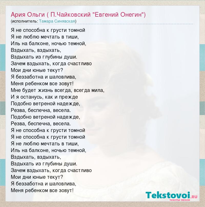 Я не способна к грусти томной Я не люблю мечтать в тиши, Иль на балконе, ночью темной, Вздыхать, вздыхать, Вздыхать из глубины души. Зачем вздыхать, когда счастливо Мои дни юные текут? Я беззаботна и шаловлива, Меня ребенком все зовут! Мне будет жизнь всегда, всегда мила, И я останусь, как и прежде Подобно ветреной надежде, Резва, беспечна, весела. Подобно ветреной надежде, Резва, беспечна, весела. Я не способна к грусти томной Я не способна к грусти томной Я не люблю мечтать в тиши, Иль на балконе, ночью темной, Вздыхать, вздыхать, Вздыхать из глубины души. Зачем вздыхать, когда счастливо Мои дни юные текут? Я беззаботна и шаловлива, Меня ребенком все зовут!