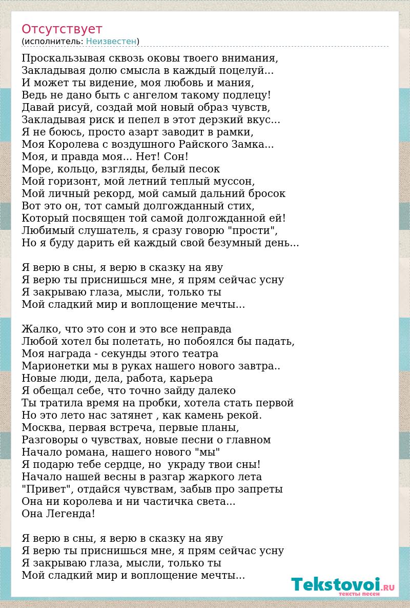 Проскальзывая сквозь оковы твоего внимания, Закладывая долю смысла в каждый поцелуй... И может ты видение, моя любовь и мания, Ведь не дано быть с ангелом такому подлецу! Давай рисуй, создай мой новый образ чувств, Закладывая риск и пепел в этот дерзкий вкус... Я не боюсь, просто азарт заводит в рамки, Моя Королева с воздушного Райского Замка... Моя, и правда моя... Нет! Сон! Море, кольцо, взгляды, белый песок Мой горизонт, мой летний теплый муссон, Мой личный рекорд, мой самый дальний бросок Вот это он, тот самый долгожданный стих, Который посвящен той самой долгожданной ей! Любимый слушатель, я сразу говорю "прости", Но я буду дарить ей каждый свой безумный день... Я верю в сны, я верю в сказку на яву Я верю ты приснишься мне, я прям сейчас усну Я закрываю глаза, мысли, только ты Мой сладкий мир и воплощение мечты... Жалко, что это сон и это все неправда Любой хотел бы полетать, но побоялся бы падать, Моя награда - секунды этого театра Марионетки мы в руках нашего нового завтра.. Новые люди, дела, работа, карьера Я обещал себе, что точно зайду далеко Ты тратила время на пробки, хотела стать первой Но это лето нас затянет , как камень рекой. Москва, первая встреча, первые планы, Разговоры о чувствах, новые песни о главном Начало романа, нашего нового "мы" Я подарю тебе сердце, но украду твои сны! Начало нашей весны в разгар жаркого лета "Привет", отдайся чувствам, забыв про запреты Она ни королева и ни частичка света... Она Легенда! Я верю в сны, я верю в сказку на яву Я верю ты приснишься мне, я прям сейчас усну Я закрываю глаза, мысли, только ты Мой сладкий мир и воплощение мечты...