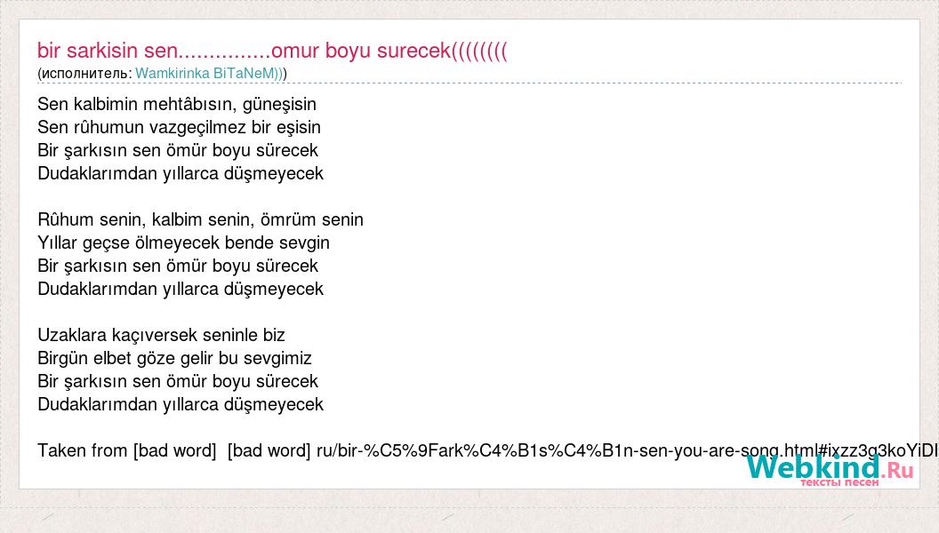 Sen kalbimin mehtâbısın, güneşisin Sen rûhumun vazgeçilmez bir eşisin Bir şarkısın sen ömür boyu sürecek Dudaklarımdan yıllarca düşmeyecek Rûhum senin, kalbim senin, ömrüm senin Yıllar geçse ölmeyecek bende sevgin Bir şarkısın sen ömür boyu sürecek Dudaklarımdan yıllarca düşmeyecek Uzaklara kaçıversek seninle biz Birgün elbet göze gelir bu sevgimiz Bir şarkısın sen ömür boyu sürecek Dudaklarımdan yıllarca düşmeyecek Taken from [bad word] [bad word] ru/bir-%C5%9Fark%C4%B1s%C4%B1n-sen-you-are-song.html#ixzz3g3koYiDI