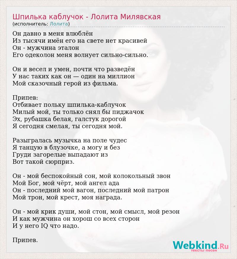 Он давно в меня влюблён Из тысячи имён его на свете нет красивей Он - мужчина эталон Его одеколон меня волнует сильно-сильно. Он и весел и умен, почти что разведён У нас таких как он — один на миллион Мой сказочный герой из фильма. Припев: Отбивает польку шпилька-каблучок Милый мой, ты только снял бы пиджачок Эх, рубашка белая, галстук дорогой Я сегодня смелая, ты сегодня мой. Разыгралась музычка на поле чудес Я танцую в блузочке, а могу и без Груди загорелые выпадают из Вот такой сюрприз. Он - мой беспокойный сон, мой колокольный звон Мой Бог, мой чёрт, мой ангел ада Он - последний мой вагон, последний мой патрон Мой трон, мой крест, моя награда. Он - мой крик души, мой стон, мой смысл, мой резон И как мужчина он хорош со всех сторон И у него IQ что надо. Припев.