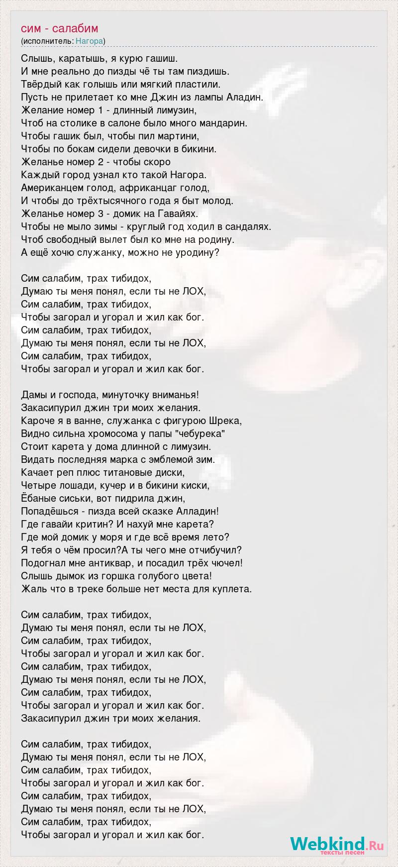 Слышь, каратышь, я курю гашиш. И мне реально до пизды чё ты там пиздишь. Твёрдый как голышь или мягкий пластили. Пусть не прилетает ко мне Джин из лампы Аладин. Желание номер 1 - длинный лимузин, Чтоб на столике в салоне было много мандарин. Чтобы гашик был, чтобы пил мартини, Чтобы по бокам сидели девочки в бикини. Желанье номер 2 - чтобы скоро Каждый город узнал кто такой Нагора. Американцем голод, африканцаг голод, И чтобы до трёхтысячного года я быт молод. Желанье номер 3 - домик на Гавайях. Чтобы не мыло зимы - круглый год ходил в сандалях. Чтоб свободный вылет был ко мне на родину. А ещё хочю служанку, можно не уродину? Сим салабим, трах тибидох, Думаю ты меня понял, если ты не ЛОХ, Сим салабим, трах тибидох, Чтобы загорал и угорал и жил как бог. Сим салабим, трах тибидох, Думаю ты меня понял, если ты не ЛОХ, Сим салабим, трах тибидох, Чтобы загорал и угорал и жил как бог. Дамы и господа, минуточку вниманья! Закасипурил джин три моих желания. Кароче я в ванне, служанка с фигурою Шрека, Видно сильна хромосома у папы "чебурека" Стоит карета у дома длинной с лимузин. Видать последняя марка с эмблемой зим. Качает реп плюс титановые диски, Четыре лошади, кучер и в бикини киски, Ёбаные сиськи, вот пидрила джин, Попадёшься - пизда всей сказке Алладин! Где гавайи критин? И нахуй мне карета? Где мой домик у моря и где всё время лето? Я тебя о чём просил?А ты чего мне отчибучил? Подогнал мне антиквар, и посадил трёх чючел! Слышь дымок из горшка голубого цвета! Жаль что в треке больше нет места для куплета. Сим салабим, трах тибидох, Думаю ты меня понял, если ты не ЛОХ, Сим салабим, трах тибидох, Чтобы загорал и угорал и жил как бог. Сим салабим, трах тибидох, Думаю ты меня понял, если ты не ЛОХ, Сим салабим, трах тибидох, Чтобы загорал и угорал и жил как бог. Закасипурил джин три моих желания. Сим салабим, трах тибидох, Думаю ты меня понял, если ты не ЛОХ, Сим салабим, трах тибидох, Чтобы загорал и угорал и жил как бог. Сим салабим, трах тибидох, Думаю ты меня понял, если ты не ЛОХ, Сим салабим, трах тибидох, Чтобы загорал и угорал и жил как бог.