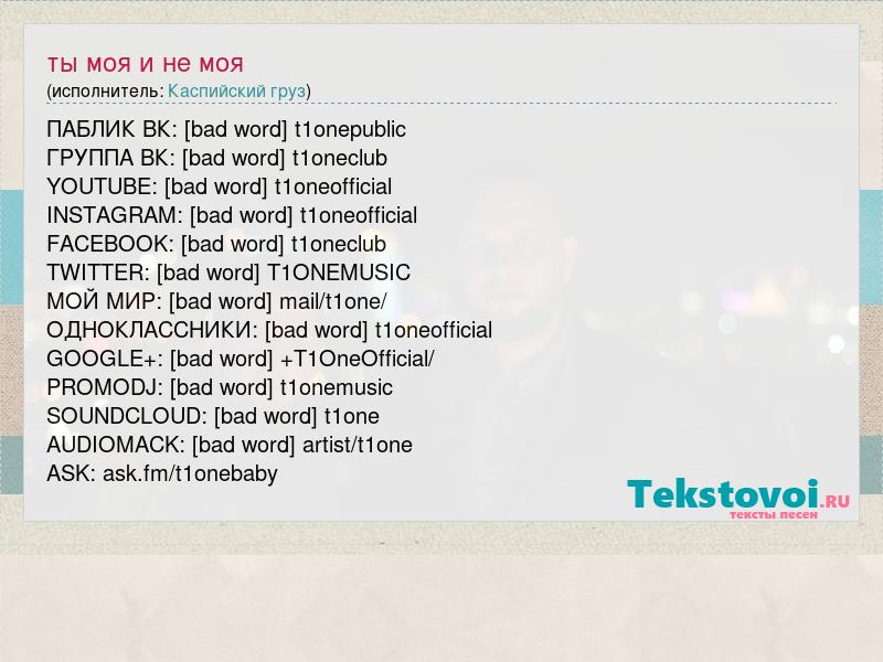 ПАБЛИК ВК: [bad word] t1onepublic ГРУППА ВК: [bad word] t1oneclub YOUTUBE: [bad word] t1oneofficial INSTAGRAM: [bad word] t1oneofficial FACEBOOK: [bad word] t1oneclub TWITTER: [bad word] T1ONEMUSIC МОЙ МИР: [bad word] mail/t1one/ ОДНОКЛАССНИКИ: [bad word] t1oneofficial GOOGLE+: [bad word] +T1OneOfficial/ PROMODJ: [bad word] t1onemusic SOUNDCLOUD: [bad word] t1one AUDIOMACK: [bad word] artist/t1one ASK: ask.fm/t1onebaby