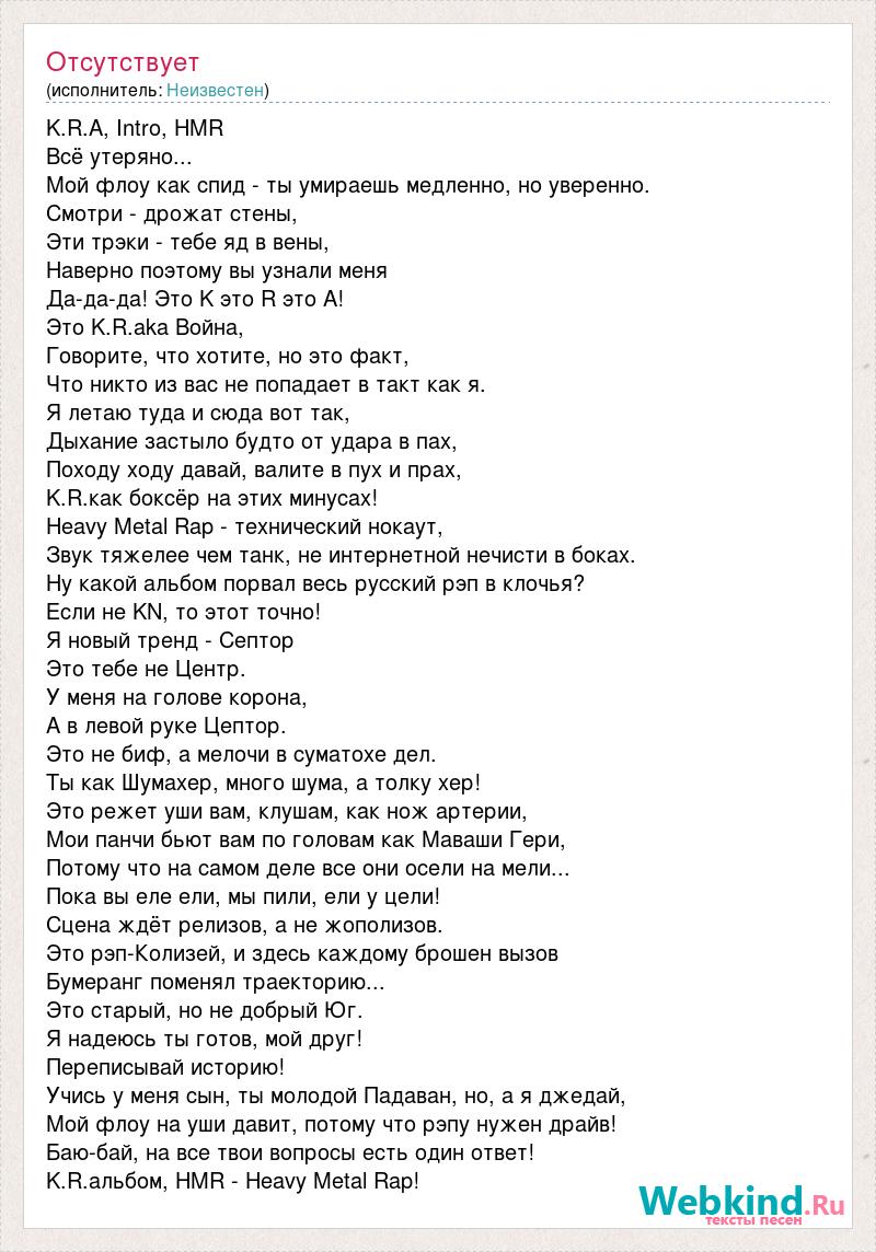 K.R.A, Intro, HMR Всё утеряно... Мой флоу как спид - ты умираешь медленно, но уверенно. Смотри - дрожат стены, Эти трэки - тебе яд в вены, Наверно поэтому вы узнали меня Да-да-да! Это K это R это A! Это K.R.aka Война, Говорите, что хотите, но это факт, Что никто из вас не попадает в такт как я. Я летаю туда и сюда вот так, Дыхание застыло будто от удара в пах, Походу ходу давай, валите в пух и прах, K.R.как боксёр на этих минусах! Heavy Metal Rap - технический нокаут, Звук тяжелее чем танк, не интернетной нечисти в боках. Ну какой альбом порвал весь русский рэп в клочья? Если не KN, то этот точно! Я новый тренд - Септор Это тебе не Центр. У меня на голове корона, А в левой руке Цептор. Это не биф, а мелочи в суматохе дел. Ты как Шумахер, много шума, а толку хер! Это режет уши вам, клушам, как нож артерии, Мои панчи бьют вам по головам как Маваши Гери, Потому что на самом деле все они осели на мели... Пока вы еле ели, мы пили, ели у цели! Сцена ждёт релизов, а не жополизов. Это рэп-Колизей, и здесь каждому брошен вызов Бумеранг поменял траекторию... Это старый, но не добрый Юг. Я надеюсь ты готов, мой друг! Переписывай историю! Учись у меня сын, ты молодой Падаван, но, а я джедай, Мой флоу на уши давит, потому что рэпу нужен драйв! Баю-бай, на все твои вопросы есть один ответ! K.R.альбом, HMR - Heavy Metal Rap!