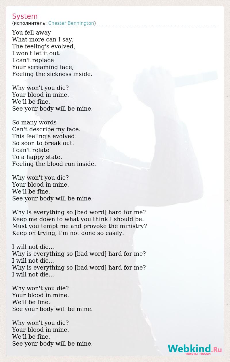 You fell away What more can I say, The feeling's evolved, I won't let it out. I can't replace Your screaming face, Feeling the sickness inside. Why won't you die? Your blood in mine. We'll be fine. See your body will be mine. So many words Can't describe my face. This feeling's evolved So soon to break out. I can't relate To a happy state. Feeling the blood run inside. Why won't you die? Your blood in mine. We'll be fine. See your body will be mine. Why is everything so [bad word] hard for me? Keep me down to what you think I should be. Must you tempt me and provoke the ministry? Keep on trying, I'm not done so easily. I will not die... Why is everything so [bad word] hard for me? I will not die... Why is everything so [bad word] hard for me? I will not die... Why won't you die? Your blood in mine. We'll be fine. See your body will be mine. Why won't you die? Your blood in mine. We'll be fine. See your body will be mine.