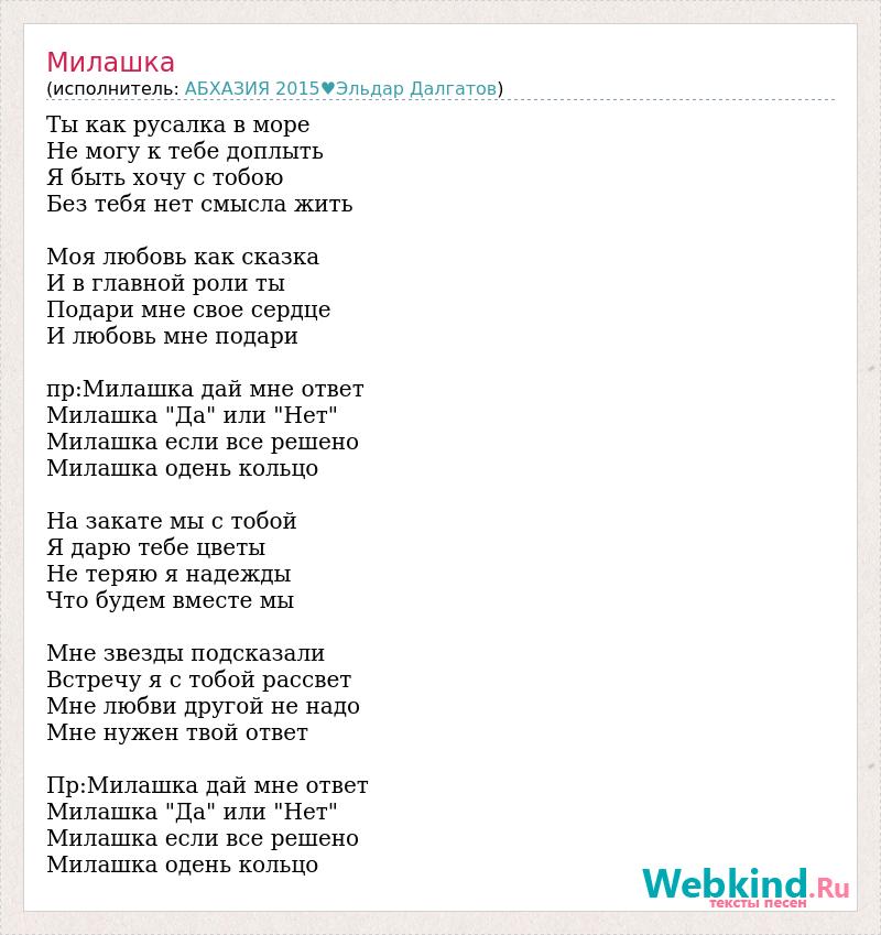 Ты как русалка в море Не могу к тебе доплыть Я быть хочу с тобою Без тебя нет смысла жить Моя любовь как сказка И в главной роли ты Подари мне свое сердце И любовь мне подари пр:Милашка дай мне ответ Милашка "Да" или "Нет" Милашка если все решено Милашка одень кольцо На закате мы с тобой Я дарю тебе цветы Не теряю я надежды Что будем вместе мы Мне звезды подсказали Встречу я с тобой рассвет Мне любви другой не надо Мне нужен твой ответ Пр:Милашка дай мне ответ Милашка "Да" или "Нет" Милашка если все решено Милашка одень кольцо