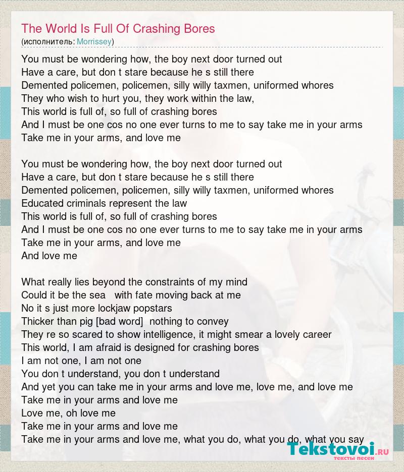 You must be wondering how, the boy next door turned out Have a care, but don t stare because he s still there Demented policemen, policemen, silly willy taxmen, uniformed whores They who wish to hurt you, they work within the law, This world is full of, so full of crashing bores And I must be one cos no one ever turns to me to say take me in your arms Take me in your arms, and love me You must be wondering how, the boy next door turned out Have a care, but don t stare because he s still there Demented policemen, policemen, silly willy taxmen, uniformed whores Educated criminals represent the law This world is full of, so full of crashing bores And I must be one cos no one ever turns to me to say take me in your arms Take me in your arms, and love me And love me What really lies beyond the constraints of my mind Could it be the sea with fate moving back at me No it s just more lockjaw popstars Thicker than pig [bad word] nothing to convey They re so scared to show intelligence, it might smear a lovely career This world, I am afraid is designed for crashing bores I am not one, I am not one You don t understand, you don t understand And yet you can take me in your arms and love me, love me, and love me Take me in your arms and love me Love me, oh love me Take me in your arms and love me Take me in your arms and love me, what you do, what you do, what you say