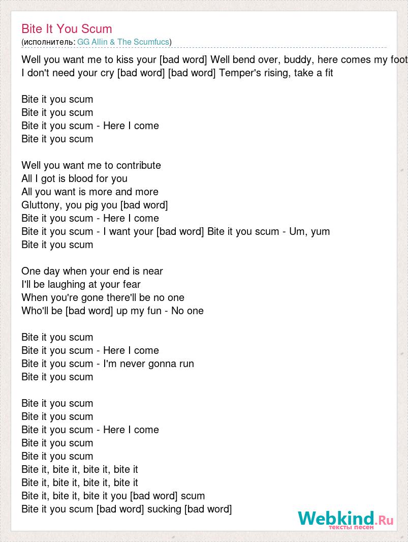 Well you want me to kiss your [bad word] Well bend over, buddy, here comes my foot I don't need your cry [bad word] [bad word] Temper's rising, take a fit Bite it you scum Bite it you scum Bite it you scum - Here I come Bite it you scum Well you want me to contribute All I got is blood for you All you want is more and more Gluttony, you pig you [bad word] Bite it you scum - Here I come Bite it you scum - I want your [bad word] Bite it you scum - Um, yum Bite it you scum One day when your end is near I'll be laughing at your fear When you're gone there'll be no one Who'll be [bad word] up my fun - No one Bite it you scum Bite it you scum - Here I come Bite it you scum - I'm never gonna run Bite it you scum Bite it you scum Bite it you scum Bite it you scum - Here I come Bite it you scum Bite it you scum Bite it, bite it, bite it, bite it Bite it, bite it, bite it, bite it Bite it, bite it, bite it you [bad word] scum Bite it you scum [bad word] sucking [bad word]