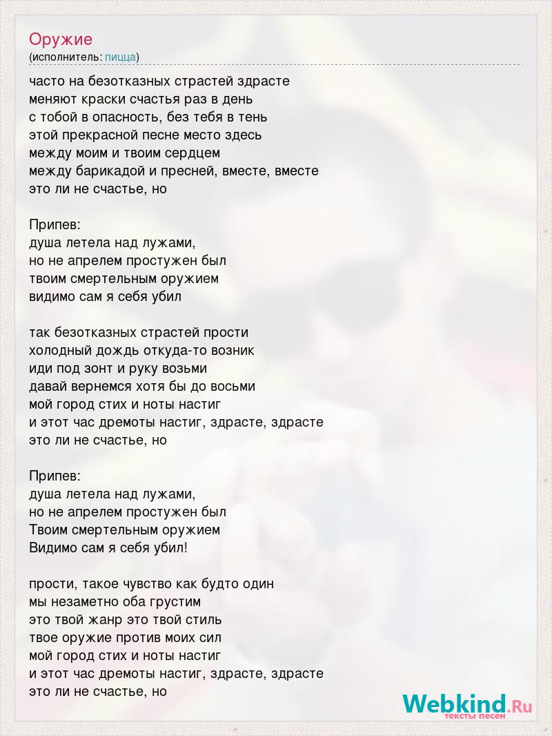 часто на безотказных страстей здрасте меняют краски счастья раз в день с тобой в опасность, без тебя в тень этой прекрасной песне место здесь между моим и твоим сердцем между барикадой и пресней, вместе, вместе это ли не счастье, но Припев: душа летела над лужами, но не апрелем простужен был твоим смертельным оружием видимо сам я себя убил так безотказных страстей прости холодный дождь откуда-то возник иди под зонт и руку возьми давай вернемся хотя бы до восьми мой город стих и ноты настиг и этот час дремоты настиг, здрасте, здрасте это ли не счастье, но Припев: душа летела над лужами, но не апрелем простужен был Твоим смертельным оружием Видимо сам я себя убил! прости, такое чувство как будто один мы незаметно оба грустим это твой жанр это твой стиль твое оружие против моих сил мой город стих и ноты настиг и этот час дремоты настиг, здрасте, здрасте это ли не счастье, но