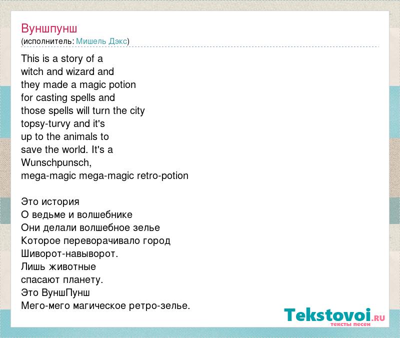 This is a story of a witch and wizard and they made a magic potion for casting spells and those spells will turn the city topsy-turvy and it's up to the animals to save the world. It's a Wunschpunsch, mega-magic mega-magic retro-potion Это история О ведьме и волшебнике Они делали волшебное зелье Которое переворачивало город Шиворот-навыворот. Лишь животные спасают планету. Это ВуншПунш Мего-мего магическое ретро-зелье.