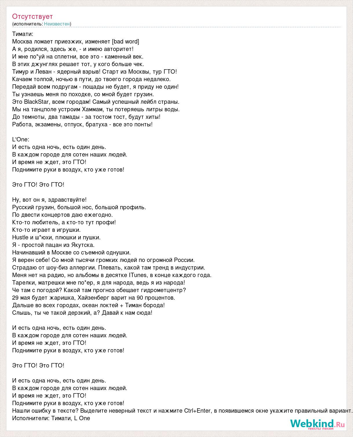 Тимати: Москва ломает приезжих, изменяет [bad word] А я, родился, здесь же, - и имею авторитет! И мне по*уй на сплетни, все это - каменный век. В этих джунглях решает тот, у кого больше чек. Тимур и Леван - ядерный взрыв! Старт из Москвы, тур ГТО! Качаем толпой, ночью в пути, до твоего города недалеко. Передай всем подругам - пощады не будет, я приду не один! Ты узнаешь меня по походке, со мной будет грузин. Это BlackStar, всем городам! Самый успешный лейбл страны. Мы на танцполе устроим Хаммам, ты потеряешь литры воды. До темноты, два тамады - за тостом тост, будут хиты! Работа, экзамены, отпуск, братуха - все это понты! L'One: И есть одна ночь, есть один день. В каждом городе для сотен наших людей. И время не ждет, это ГТО! Поднимите руки в воздух, кто уже готов! Это ГТО! Это ГТО! Ну, вот он я, здравствуйте! Русский грузин, большой нос, большой профиль. По двести концертов даю ежегодно. Кто-то любитель, а кто-то тут профи! Кто-то играет в игрушки. Hustle и ш*юхи, плюшки и пушки. Я - простой пацан из Якутска. Начинавший в Москве со съемной однушки. Я верен себе! Со мной тысячи громких людей по огромной России. Страдаю от шоу-биз аллергии. Плевать, какой там тренд в индустрии. Меня нет на радио, но альбомы в десятке ITunes, в конце каждого года. Тарелки, матрешки мне по*ер, я для народа, ведь я из народа! Че там с погодой? Какой там прогноз обещает гидрометцентр? 29 мая будет жаришка, Хайзенберг варит на 90 процентов. Дальше во всех городах, океан локтей + Тиман борода! Слышь, ты че такой дерзкий, а? Давай к нам сюда! И есть одна ночь, есть один день. В каждом городе для сотен наших людей. И время не ждет, это ГТО! Поднимите руки в воздух, кто уже готов! Это ГТО! Это ГТО! И есть одна ночь, есть один день. В каждом городе для сотен наших людей. И время не ждет, это ГТО! Поднимите руки в воздух, кто уже готов! Нашли ошибку в тексте? Выделите неверный текст и нажмите Ctrl+Enter, в появившемся окне укажите правильный вариант. Исполнители: Тимати, L One