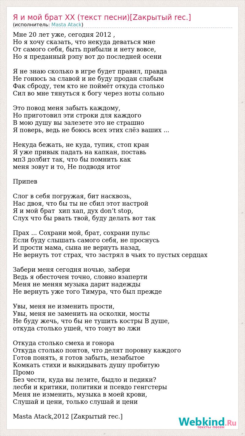 Мне 20 лет уже, сегодня 2012 , Но я хочу сказать, что некуда деваться мне От самого себя, быть прибыли и нету вовсе, Но я преданный рэпу вот до последней осени Я не знаю сколько в игре будет правил, правда Не гонюсь за славой и не буду продан слабым Фак сброду, тем кто не поймёт откуда столько Сил во мне тянуться к богу через ноты сольно Это повод меня забыть каждому, Но приготовил эти строки для каждого В мою душу вы залезете это не страшно Я поверь, ведь не боюсь всех этих слёз ваших ... Некуда бежать, не куда, тупик, стоп кран Я уже привык падать на капкан, поставь мп3 долбит так, что бы помнить как меня зовут и то, Не подводя итог Припев Слог в себя погружая, бит насквозь, Нас двоя, что бы ты не сбил этот настрой Я и мой брат хип хап, дух don’t stop, Слух что бы рвать твой, буду делать вот так Прах ... Сохрани мой, брат, сохрани пульс Если буду слышать самого себя, не проснусь И прости мама, сына не вернуть назад, Не вернуть тот страх, что застрял в чьих то пустых сердцах Забери меня сегодня ночью, забери Ведь я обесточен точно, словно взаперти Меня не меняя музыка дарит надежды Не вернуть уже того Тимура, что был прежде Увы, меня не изменить прости, Увы, меня не заменить на осколки, мосты Не буду жечь, что бы не тушить костры В душе, откуда столько ушей, что тонут во лжи Откуда столько смеха и гонора Откуда столько понтов, что делят поровну каждого Готов понять, я готов забыть, незабытое Комкать стихи и выкидывать душу пробитую Промо Без чести, куда вы лезите, быдло и педики? лесби и критики, политики и псевдо генгстеры Меня не изменить, музыка в моей крови, Слушай и цени, только слушай и цени Masta Atack,2012 [Zакрытый rec.]