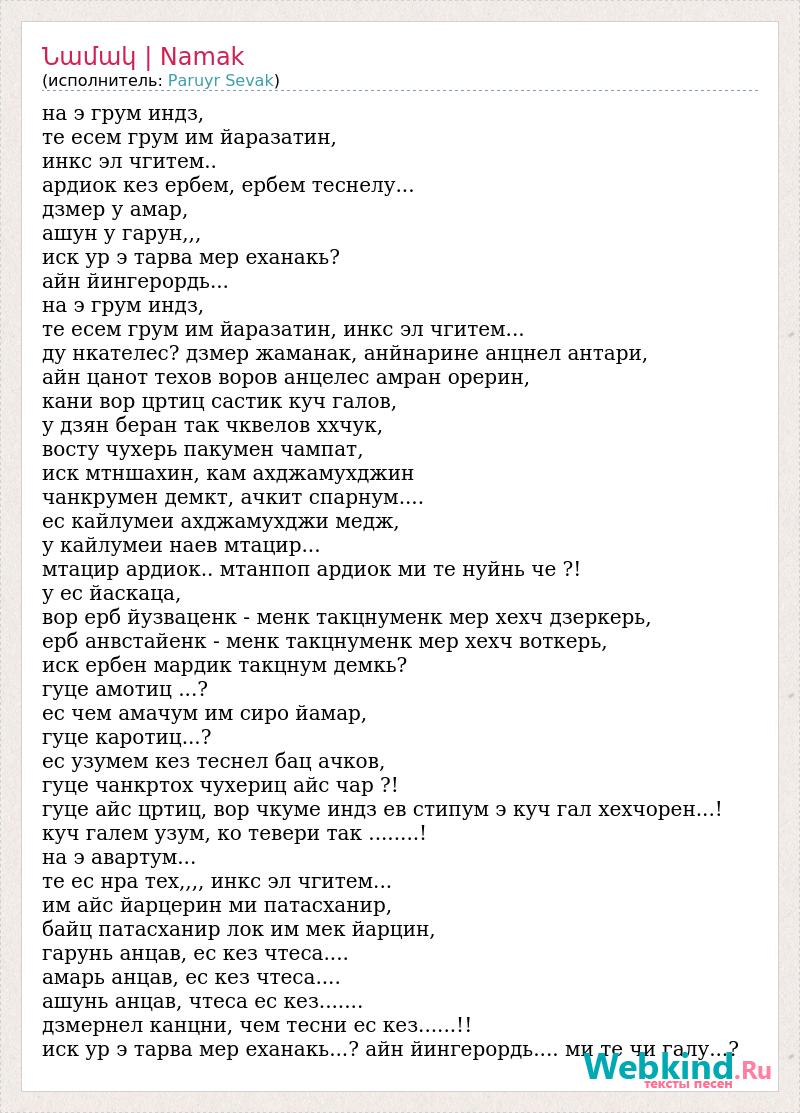 на э грум индз, те есем грум им йаразатин, инкс эл чгитем.. ардиок кез ербем, ербем теснелу... дзмер у амар, ашун у гарун,,, иск ур э тарва мер еханакь? айн йингерордь... на э грум индз, те есем грум им йаразатин, инкс эл чгитем... ду нкателес? дзмер жаманак, анйнарине анцнел антари, айн цанот техов воров анцелес амран орерин, кани вор цртиц састик куч галов, у дзян беран так чквелов ххчук, восту чухерь пакумен чампат, иск мтншахин, кам ахджамухджин чанкрумен демкт, ачкит спарнум.... ес кайлумеи ахджамухджи медж, у кайлумеи наев мтацир... мтацир ардиок.. мтанпоп ардиок ми те нуйнь че ?! у ес йаскаца, вор ерб йузваценк - менк такцнуменк мер хехч дзеркерь, ерб анвстайенк - менк такцнуменк мер хехч воткерь, иск ербен мардик такцнум демкь? гуце амотиц ...? ес чем амачум им сиро йамар, гуце каротиц...? ес узумем кез теснел бац ачков, гуце чанкртох чухериц айс чар ?! гуце айс цртиц, вор чкуме индз ев стипум э куч гал хехчорен...! куч галем узум, ко тевери так ........! на э авартум... те ес нра тех,,,, инкс эл чгитем... им айс йарцерин ми патасханир, байц патасханир лок им мек йарцин, гарунь анцав, ес кез чтеса.... амарь анцав, ес кез чтеса.... ашунь анцав, чтеса ес кез....... дзмернел канцни, чем тесни ес кез......!! иск ур э тарва мер еханакь...? айн йингерордь.... ми те чи галу...?