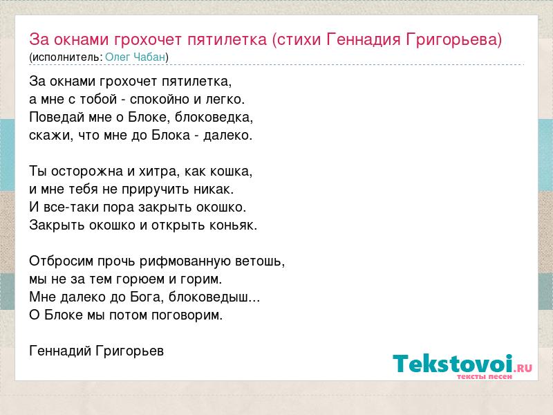 За окнами грохочет пятилетка, а мне с тобой - спокойно и легко. Поведай мне о Блоке, блоковедка, скажи, что мне до Блока - далеко. Ты осторожна и хитра, как кошка, и мне тебя не приручить никак. И все-таки пора закрыть окошко. Закрыть окошко и открыть коньяк. Отбросим прочь рифмованную ветошь, мы не за тем горюем и горим. Мне далеко до Бога, блоковедыш... О Блоке мы потом поговорим. Геннадий Григорьев