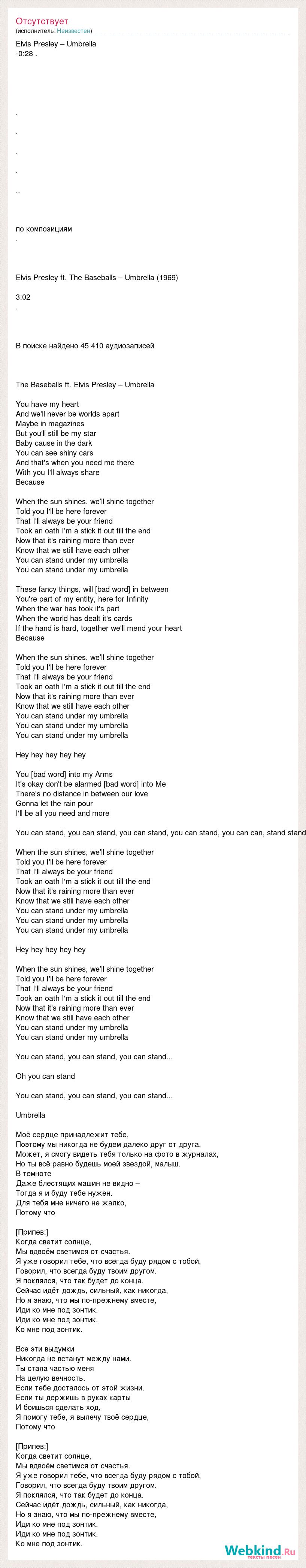 Elvis Presley – Umbrella -0:28 . . . . . .. по композициям . Elvis Presley ft. The Baseballs – Umbrella (1969) 3:02 . В поиске найдено 45 410 аудиозаписей The Baseballs ft. Elvis Presley – Umbrella You have my heart And we'll never be worlds apart Maybe in magazines But you'll still be my star Baby cause in the dark You can see shiny cars And that's when you need me there With you I'll always share Because When the sun shines, we’ll shine together Told you I'll be here forever That I'll always be your friend Took an oath I'm a stick it out till the end Now that it's raining more than ever Know that we still have each other You can stand under my umbrella You can stand under my umbrella These fancy things, will [bad word] in between You're part of my entity, here for Infinity When the war has took it's part When the world has dealt it's cards If the hand is hard, together we'll mend your heart Because When the sun shines, we’ll shine together Told you I'll be here forever That I'll always be your friend Took an oath I'm a stick it out till the end Now that it's raining more than ever Know that we still have each other You can stand under my umbrella You can stand under my umbrella You can stand under my umbrella Hey hey hey hey hey You [bad word] into my Arms It's okay don't be alarmed [bad word] into Me There's no distance in between our love Gonna let the rain pour I'll be all you need and more You can stand, you can stand, you can stand, you can stand, you can can, stand stand When the sun shines, we’ll shine together Told you I'll be here forever That I'll always be your friend Took an oath I'm a stick it out till the end Now that it's raining more than ever Know that we still have each other You can stand under my umbrella You can stand under my umbrella You can stand under my umbrella Hey hey hey hey hey When the sun shines, we’ll shine together Told you I'll be here forever That I'll always be your friend Took an oath I'm a stick it out till the end Now that it's raining more than ever Know that we still have each other You can stand under my umbrella You can stand under my umbrella You can stand, you can stand, you can stand... Oh you can stand You can stand, you can stand, you can stand... Umbrella Моё сердце принадлежит тебе, Поэтому мы никогда не будем далеко друг от друга. Может, я смогу видеть тебя только на фото в журналах, Но ты всё равно будешь моей звездой, малыш. В темноте Даже блестящих машин не видно – Тогда я и буду тебе нужен. Для тебя мне ничего не жалко, Потому что [Припев:] Когда светит солнце, Мы вдвоём светимся от счастья. Я уже говорил тебе, что всегда буду рядом с тобой, Говорил, что всегда буду твоим другом. Я поклялся, что так будет до конца. Сейчас идёт дождь, сильный, как никогда, Но я знаю, что мы по-прежнему вместе, Иди ко мне под зонтик. Иди ко мне под зонтик. Ко мне под зонтик. Все эти выдумки Никогда не встанут между нами. Ты стала частью меня На целую вечность. Если тебе досталось от этой жизни. Если ты держишь в руках карты И боишься сделать ход, Я помогу тебе, я вылечу твоё сердце, Потому что [Припев:] Когда светит солнце, Мы вдвоём светимся от счастья. Я уже говорил тебе, что всегда буду рядом с тобой, Говорил, что всегда буду твоим другом. Я поклялся, что так будет до конца. Сейчас идёт дождь, сильный, как никогда, Но я знаю, что мы по-прежнему вместе, Иди ко мне под зонтик. Иди ко мне под зонтик. Ко мне под зонтик.