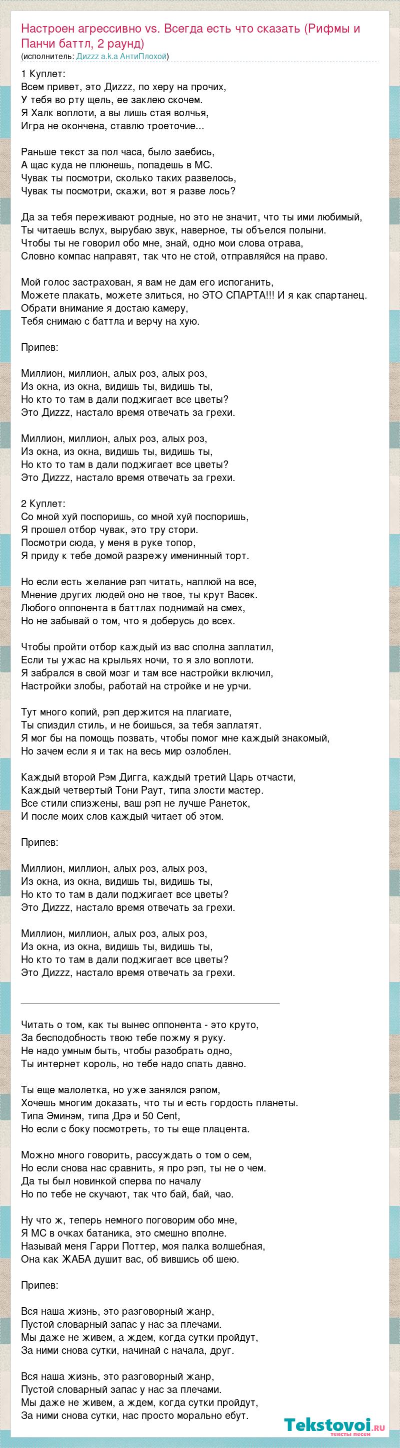1 Куплет: Всем привет, это Диzzz, по херу на прочих, У тебя во рту щель, ее заклею скочем. Я Халк воплоти, а вы лишь стая волчья, Игра не окончена, ставлю троеточие... Раньше текст за пол часа, было заебись, А щас куда не плюнешь, попадешь в МС. Чувак ты посмотри, сколько таких развелось, Чувак ты посмотри, скажи, вот я разве лось? Да за тебя переживают родные, но это не значит, что ты ими любимый, Ты читаешь вслух, вырубаю звук, наверное, ты объелся полыни. Чтобы ты не говорил обо мне, знай, одно мои слова отрава, Словно компас направят, так что не стой, отправляйся на право. Мой голос застрахован, я вам не дам его испоганить, Можете плакать, можете злиться, но ЭТО СПАРТА!!! И я как спартанец. Обрати внимание я достаю камеру, Тебя снимаю с баттла и верчу на хую. Припев: Миллион, миллион, алых роз, алых роз, Из окна, из окна, видишь ты, видишь ты, Но кто то там в дали поджигает все цветы? Это Диzzz, настало время отвечать за грехи. Миллион, миллион, алых роз, алых роз, Из окна, из окна, видишь ты, видишь ты, Но кто то там в дали поджигает все цветы? Это Диzzz, настало время отвечать за грехи. 2 Куплет: Со мной хуй поспоришь, со мной хуй поспоришь, Я прошел отбор чувак, это тру стори. Посмотри сюда, у меня в руке топор, Я приду к тебе домой разрежу именинный торт. Но если есть желание рэп читать, наплюй на все, Мнение других людей оно не твое, ты крут Васек. Любого оппонента в баттлах поднимай на смех, Но не забывай о том, что я доберусь до всех. Чтобы пройти отбор каждый из вас сполна заплатил, Если ты ужас на крыльях ночи, то я зло воплоти. Я забрался в свой мозг и там все настройки включил, Настройки злобы, работай на стройке и не урчи. Тут много копий, рэп держится на плагиате, Ты спиздил стиль, и не боишься, за тебя заплатят. Я мог бы на помощь позвать, чтобы помог мне каждый знакомый, Но зачем если я и так на весь мир озлоблен. Каждый второй Рэм Дигга, каждый третий Царь отчасти, Каждый четвертый Тони Раут, типа злости мастер. Все стили спизжены, ваш рэп не лучше Ранеток, И после моих слов каждый читает об этом. Припев: Миллион, миллион, алых роз, алых роз, Из окна, из окна, видишь ты, видишь ты, Но кто то там в дали поджигает все цветы? Это Диzzz, настало время отвечать за грехи. Миллион, миллион, алых роз, алых роз, Из окна, из окна, видишь ты, видишь ты, Но кто то там в дали поджигает все цветы? Это Диzzz, настало время отвечать за грехи. _______________________________________________ Читать о том, как ты вынес оппонента - это круто, За бесподобность твою тебе пожму я руку. Не надо умным быть, чтобы разобрать одно, Ты интернет король, но тебе надо спать давно. Ты еще малолетка, но уже занялся рэпом, Хочешь многим доказать, что ты и есть гордость планеты. Типа Эминэм, типа Дрэ и 50 Cent, Но если с боку посмотреть, то ты еще плацента. Можно много говорить, рассуждать о том о сем, Но если снова нас сравнить, я про рэп, ты не о чем. Да ты был новинкой сперва по началу Но по тебе не скучают, так что бай, бай, чао. Ну что ж, теперь немного поговорим обо мне, Я МС в очках батаника, это смешно вполне. Называй меня Гарри Поттер, моя палка волшебная, Она как ЖАБА душит вас, об вившись об шею. Припев: Вся наша жизнь, это разговорный жанр, Пустой словарный запас у нас за плечами. Мы даже не живем, а ждем, когда сутки пройдут, За ними снова сутки, начинай с начала, друг. Вся наша жизнь, это разговорный жанр, Пустой словарный запас у нас за плечами. Мы даже не живем, а 