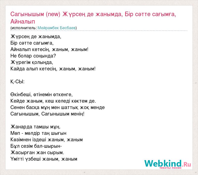 Жүрсең де жанымда, Бір сәтте сағымға, Айналып кетесің, жаным, жаным! Не болар соңында? Жүрегім қолыңда, Кайда алып кетесің, жаным, жаным! Қ-СЫ: Өкінбеші, өтінемін өткенге, Кейде жаным, кеш келеді көктем де. Сенен басқа мұң мен шаттық жоқ менде Сағынышым, Сағынышым менің! Жанарда тамшы мұң. Мөп - мөлдір таң шығын Көзімнен іздеші жаным, жаным Бұл сезім бал-шырын- Жасырған жан сырым. Үмітті үзбеші жаным, жаным