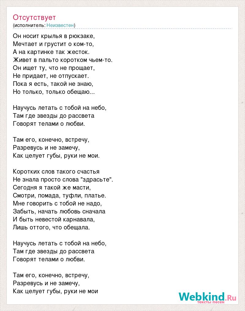 Он носит крылья в рюкзаке, Мечтает и грустит о ком-то, А на картинке так жесток. Живет в пальто коротком чьем-то. Он ищет ту, что не прощает, Не придает, не отпускает. Пока я есть, такой не знаю, Но только, только обещаю... Научусь летать с тобой на небо, Там где звезды до рассвета Говорят телами о любви. Там его, конечно, встречу, Разревусь и не замечу, Как целует губы, руки не мои. Коротких слов такого счастья Не знала просто слова "здрасьте". Сегодня я такой же масти, Смотри, помада, туфли, платье. Мне говорить с тобой не надо, Забыть, начать любовь сначала И быть невестой карнавала, Лишь оттого, что обещала. Научусь летать с тобой на небо, Там где звезды до рассвета Говорят телами о любви. Там его, конечно, встречу, Разревусь и не замечу, Как целует губы, руки не мои