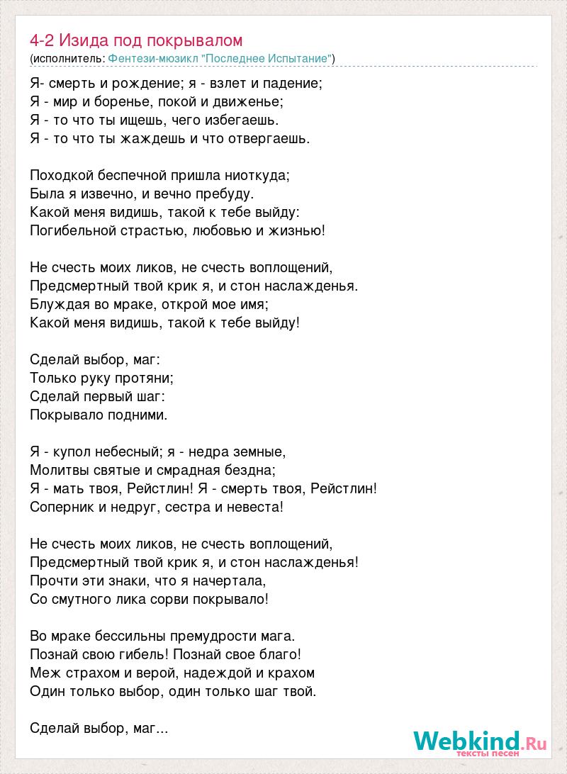 Я- смерть и рождение; я - взлет и падение; Я - мир и боренье, покой и движенье; Я - то что ты ищешь, чего избегаешь. Я - то что ты жаждешь и что отвергаешь. Походкой беспечной пришла ниоткуда; Была я извечно, и вечно пребуду. Какой меня видишь, такой к тебе выйду: Погибельной страстью, любовью и жизнью! Не счесть моих ликов, не счесть воплощений, Предсмертный твой крик я, и стон наслажденья. Блуждая во мраке, открой мое имя; Какой меня видишь, такой к тебе выйду! Сделай выбор, маг: Только руку протяни; Сделай первый шаг: Покрывало подними. Я - купол небесный; я - недра земные, Молитвы святые и смрадная бездна; Я - мать твоя, Рейстлин! Я - смерть твоя, Рейстлин! Соперник и недруг, сестра и невеста! Не счесть моих ликов, не счесть воплощений, Предсмертный твой крик я, и стон наслажденья! Прочти эти знаки, что я начертала, Со смутного лика сорви покрывало! Во мраке бессильны премудрости мага. Познай свою гибель! Познай свое благо! Меж страхом и верой, надеждой и крахом Один только выбор, один только шаг твой. Сделай выбор, маг...