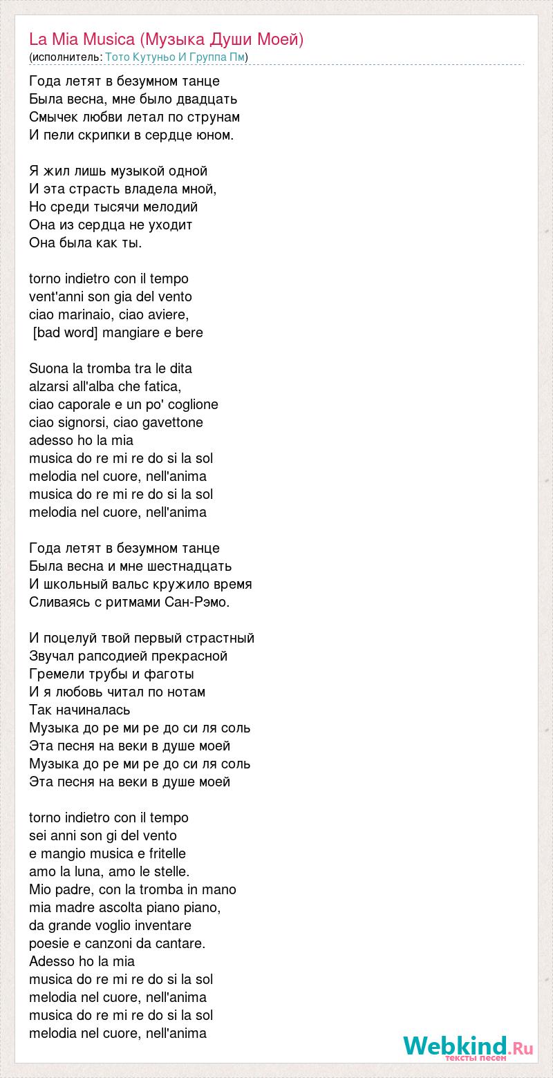 Года летят в безумном танце Была весна, мне было двадцать Смычек любви летал по струнам И пели скрипки в сердце юном. Я жил лишь музыкой одной И эта страсть владела мной, Но среди тысячи мелодий Она из сердца не уходит Она была как ты. torno indietro con il tempo vent'anni son gia del vento ciao marinaio, ciao aviere, [bad word] mangiare e bere Suona la tromba tra le dita alzarsi all'alba che fatica, ciao caporale e un po' coglione ciao signorsi, ciao gavettone adesso ho la mia musica do re mi re do si la sol melodia nel cuore, nell'anima musica do re mi re do si la sol melodia nel cuore, nell'anima Года летят в безумном танце Была весна и мне шестнадцать И школьный вальс кружило время Сливаясь с ритмами Сан-Рэмо. И поцелуй твой первый страстный Звучал рапсодией прекрасной Гремели трубы и фаготы И я любовь читал по нотам Так начиналась Музыка до ре ми ре до си ля соль Эта песня на веки в душе моей Музыка до ре ми ре до си ля соль Эта песня на веки в душе моей torno indietro con il tempo sei anni son gi del vento e mangio musica e fritelle amo la luna, amo le stelle. Mio padre, con la tromba in mano mia madre ascolta piano piano, da grande voglio inventare poesie e canzoni da cantare. Adesso ho la mia musica do re mi re do si la sol melodia nel cuore, nell'anima musica do re mi re do si la sol melodia nel cuore, nell'anima