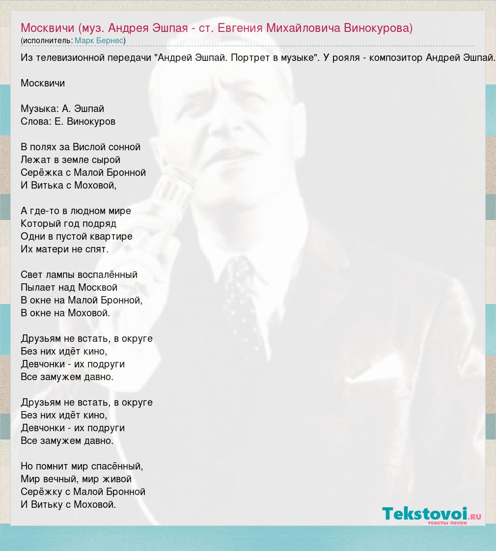 Из телевизионной передачи "Андрей Эшпай. Портрет в музыке". У рояля - композитор Андрей Эшпай. Москвичи Музыка: А. Эшпай Слова: Е. Винокуров В полях за Вислой сонной Лежат в земле сырой Серёжка с Малой Бронной И Витька с Моховой, А где-то в людном мире Который год подряд Одни в пустой квартире Их матери не спят. Свет лампы воспалённый Пылает над Москвой В окне на Малой Бронной, В окне на Моховой. Друзьям не встать, в округе Без них идёт кино, Девчонки - их подруги Все замужем давно. Друзьям не встать, в округе Без них идёт кино, Девчонки - их подруги Все замужем давно. Но помнит мир спасённый, Мир вечный, мир живой Серёжку с Малой Бронной И Витьку с Моховой.